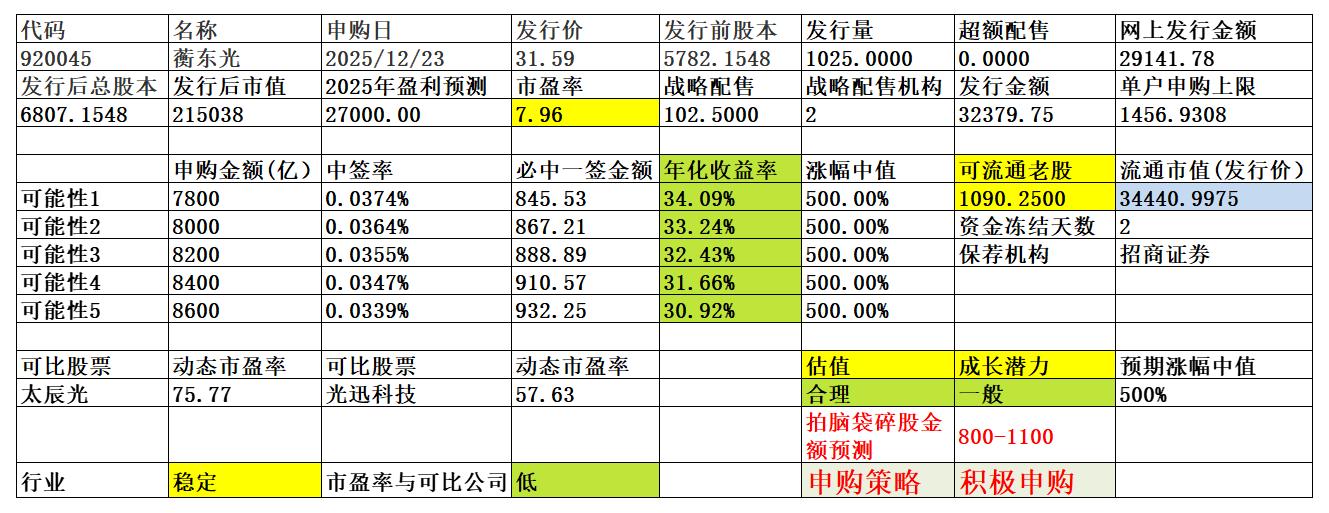 申购建议:公司所处行业发展迅速,公司质地较好,发行动态市盈率极低。但流通老股较多。可积极申购。本次顶格估计是1+1,申购资金大概率超过7800亿,碎股金额预计800-1100万之间。鉴于本次申购收益较高,必须争取1+1,100股的收益可能有1.5万元以上。