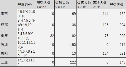 既然没有完美的城市,那就找城市组合,我前年专门查了几个城市的历史气温,统计了一年中的冷热天数,根据自己的耐受程度(10-30°C)算出舒适的天数和舒适月份,其中带星号的月份可能只有一半时间是舒服的,不带星的月份也不是绝对舒服,毕竟有极端天气。