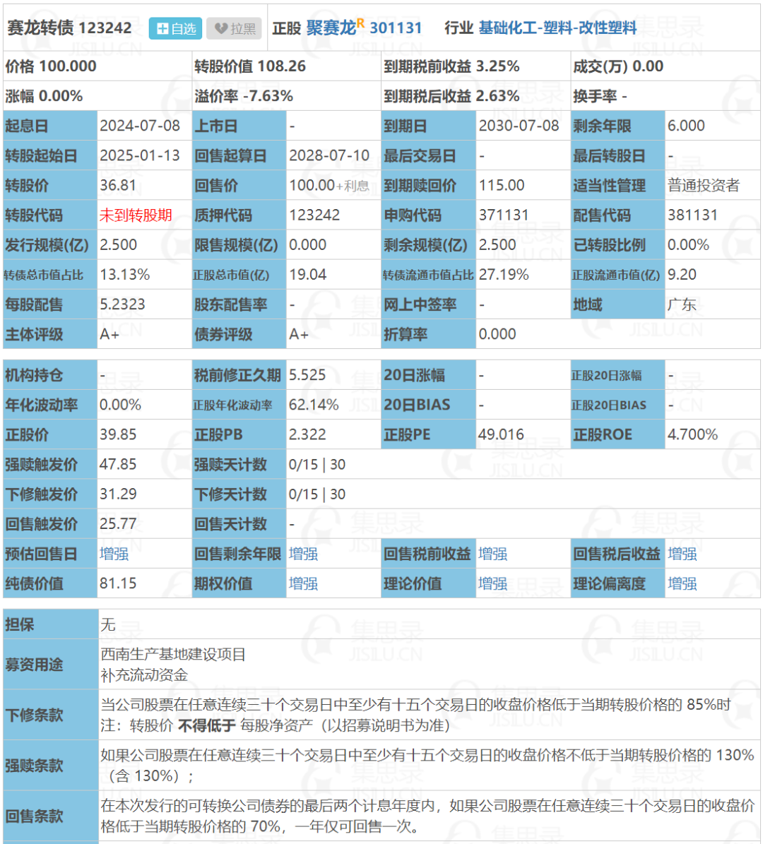 赛龙转债:(正股代码:301131,配债代码:381131·)