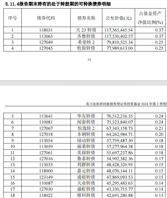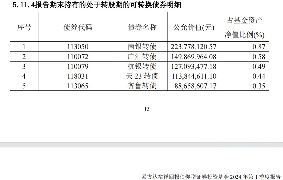2024年3月末,易方达裕祥回报持有广汇转债162万张。广汇转债当季最高价94.248,最低价83.83,均价89.358。