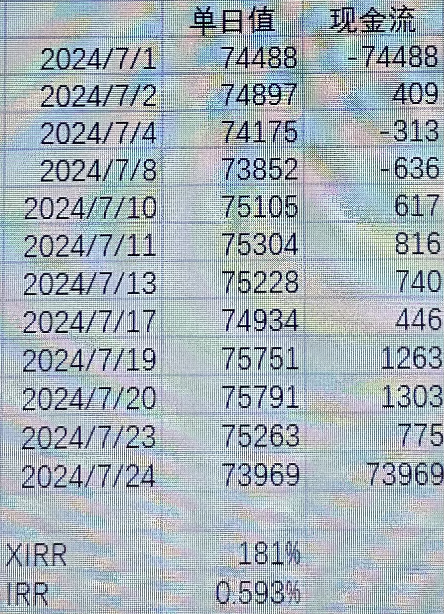 采用xirr计算了一下,明明是亏钱的,怎么计算结果收益率还是正值,而且非常离谱。