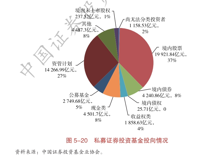 截至2022年末,从私募证券投资基金的具体投资方向来看,投向境内股票的规模最大,投资规模共计1.99万亿元 ,占所持有各类资产规模的37.27%;其次为资管计划,投资规模共计1.43万亿元,占比26.69%。