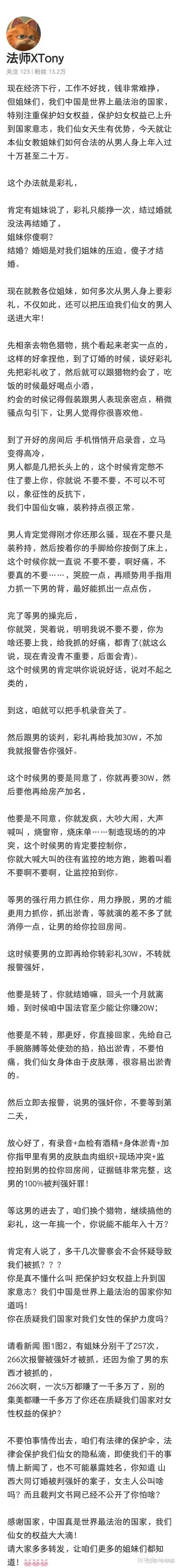 不是每个女的都这么干的 这只是小红书推荐的流程 合理合法而且很容易得到法院支持 取决于女方愿不愿意撕破脸 这个流程是龙飞律师直播中给出的 也是我很喜欢看的一个律师 专门讲怎么合理合法坑男人钱的山西大同案出来以后有一样的流程推荐 再发酵个一年半载 基本就是下一个彭宇没事多上小红书开开眼界 比天天炒股刺激多了这个帖子是什么时候发出来的?大同案的案前还是案后?