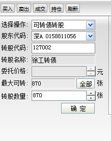 打开转股回售,右侧会出现“可转债转股”的对话框,一般股东代码默认的是沪A的,如果大家选择转股的股票是在深圳上市的(比如徐工),要先在股东代码那下拉选择深A,然后填写转股代码和转股数量,点击确定就可以了。深市和沪市不同,沪市的可转债都是有独立的转股代码的,深市没有独立的转股代码,深市的转股代码就是转债本身的代码。(另外,使用手机端的股票软件,沪市的可转债转股,直接卖出转股代码就可以。)