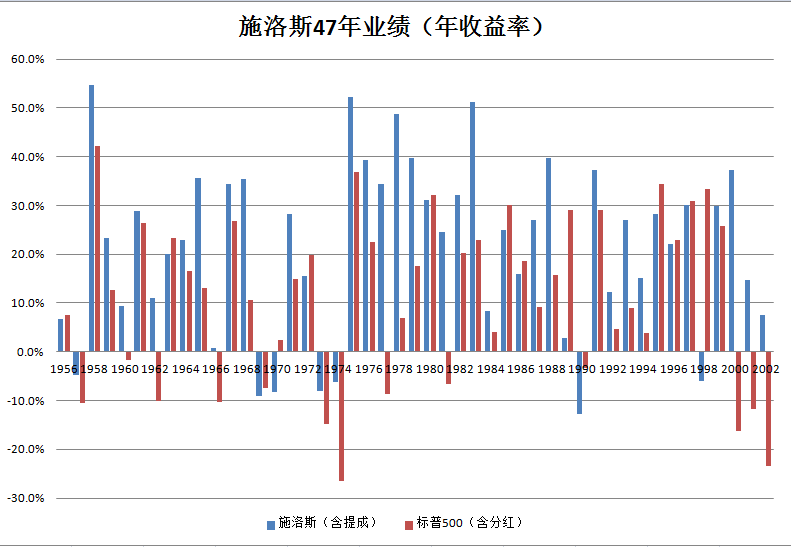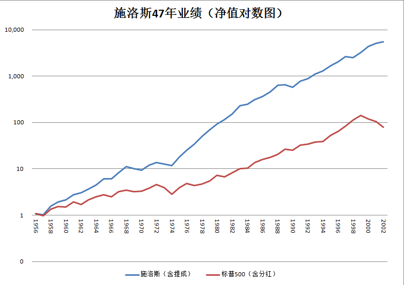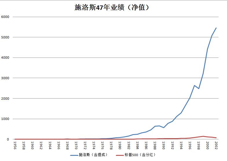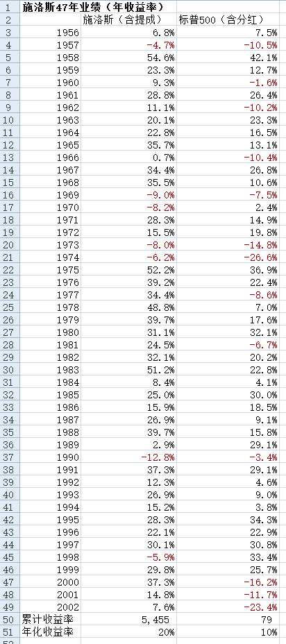 施洛斯在有据可考的1956-2002的47年里,创造了5455倍的收益率,年化约20%。同期标普500的收益率是79倍,年化约10%。