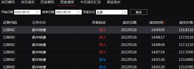 凯中这几笔算吧?抓到靠的是该卖的时候挂卖单,该买的时候挂买单。迪贝卖出多笔多数在120-130间。