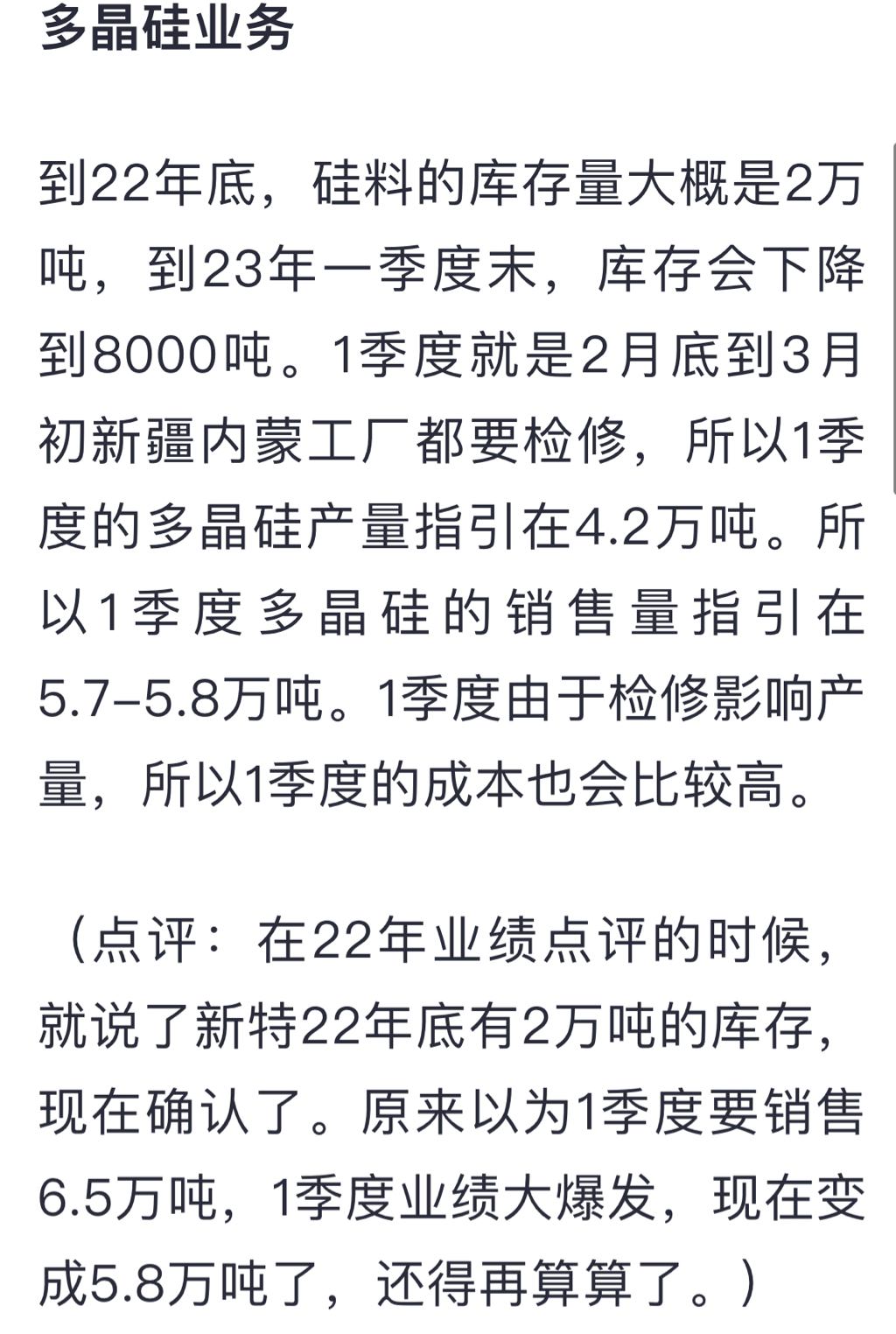 转自雪球派大蓝星: 由于在12月初预测业绩,12月硅料价钱大幅下降,会影响到业绩预测,我虽然自己一直在更新业绩预测值,但是没有再发贴了。特变后来的预测值为171亿,下面图是1月初的预测值了。但是今天发的公告中位数为163亿,还是比预测值低一些。看了通威股份(SH600438) 的业绩预告,中位数275亿,由于有36亿减值,预测时这个没考虑到,不然预测基本正确,大全能源(SH688303) 和后来考虑硅料跌价后的预测值也差不多。看来就是特变低了,看了下新特的业绩预告,果然拉垮了,全年130亿,4季度36亿,这个可是妥妥的低于预期了,毕竟新特4季度还有新产能,看来新特4季度的销售量很低,或者成本很高。但这个业绩,又说明一个问题,特变的非硅业务不错,新特四季度36亿,特变占23亿,四季度中位数51亿,那么其他业务就是28亿,和预测的结果十分吻合。特变由于新产能的投放,销售量成本都搞不清楚,所以不确定性太大了。但是特变四季度是环比增长的,23年如果硅料下跌比较快,特变业绩小幅下降,到24年,业绩又可从回增长,也就是23年将是业绩最低点。大全业绩会出现断崖式下跌,可能跌至七八十亿,毕竟硅料到10万以下是硅料的最终宿命。另外,明天特变股价应该能涨,业绩不算拉垮,外加回购又重新启动