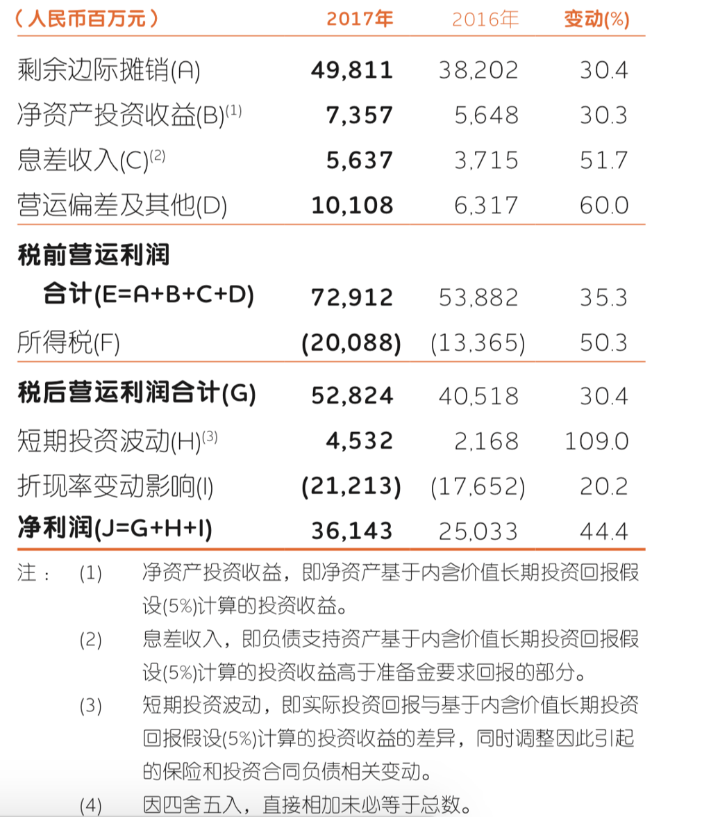 2.净资产投资收益,根据注释,“净资产投资收益,即净资产基于内含价值长期投资回报假 设(5%)计算的投资收益”,我们前面解释了17年内含价值增长了30%,所以这部分用17年的73.57乘(1+30%)计算得95.7亿