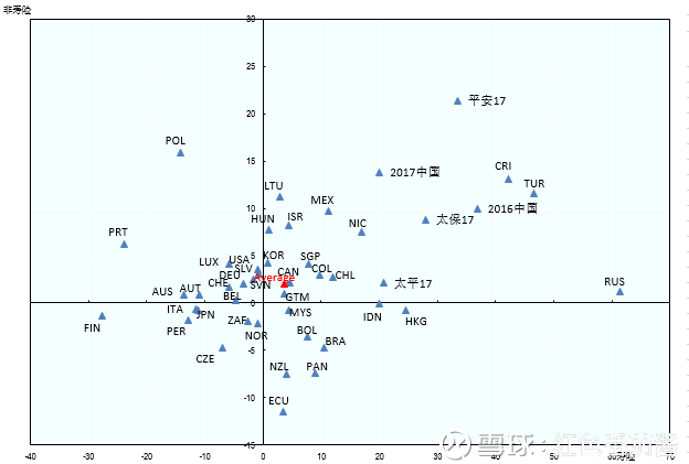 横轴代表寿险保费增速,纵轴代表非寿险保费增速,大家可以看看我国的保险业处在怎样一个黄金时代