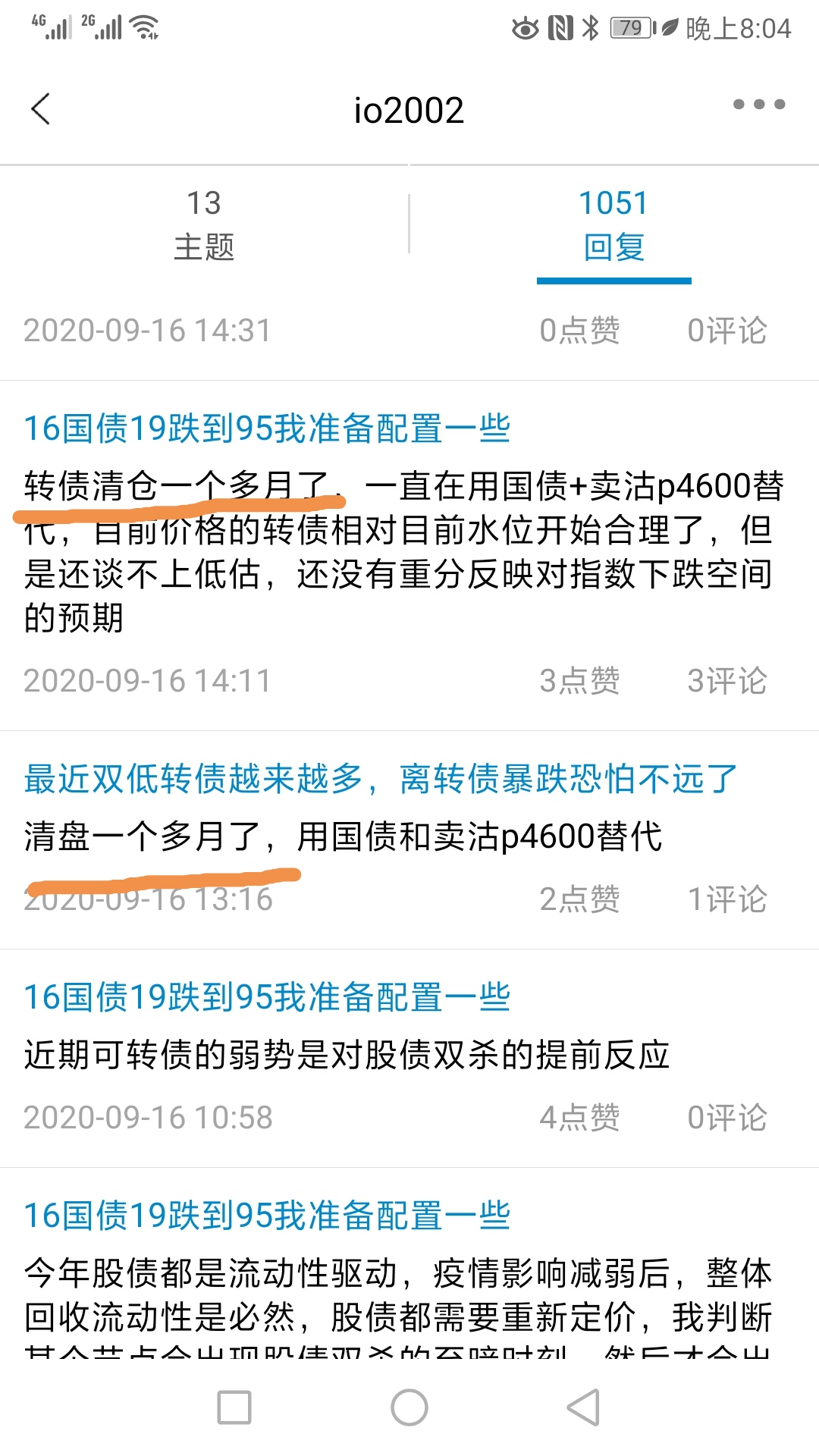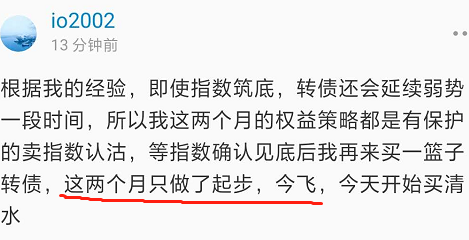 帖子就是用来探讨的,关于大盘我在师座的帖子里聊,可转债我在凌老板帖子里聊,国债我在自己的帖子里聊,其实我选择可转债的思路很清楚啊,会用国债+期权期指贴水去对比,整体便宜了就一篮子,贵了就用国债和衍生品替代,就算整体贵了,也会有一两只相对便宜的,我选择的标准和凌老板的区别是