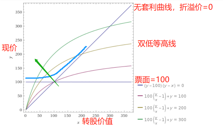 这种情况通常是因为市场情绪造成的,例如转股溢价低的可转债纷纷上涨,引起转股溢价率高的可转债也跟随上涨,并逐渐脱离债券底部。遇到这种情况,应及早兑现利润出局,因为一旦市场情绪转换,这些转债将是杀跌的首选。