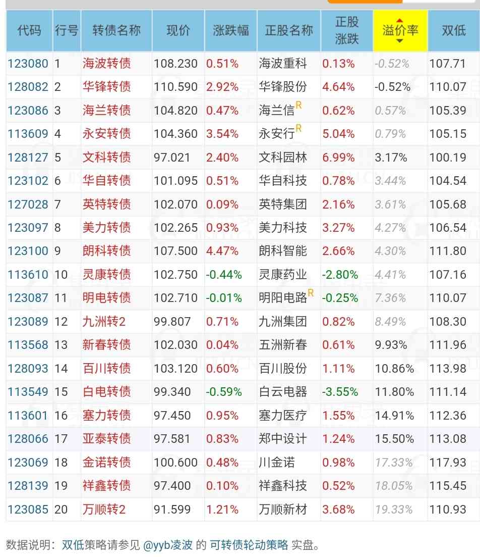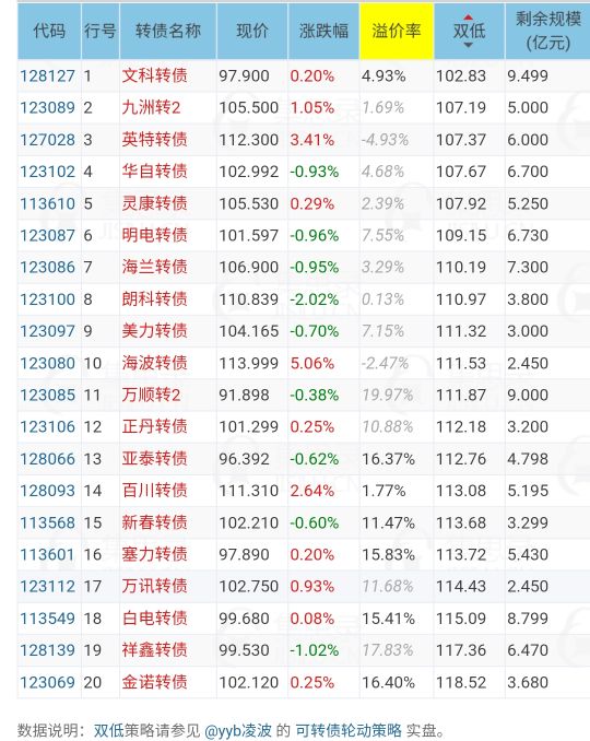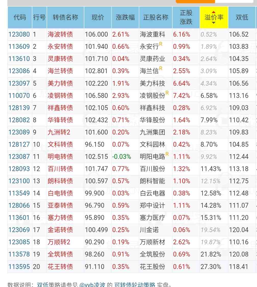 对可转债价格和溢价率*100进行相加,值越小排名越排前。统计结果如下
