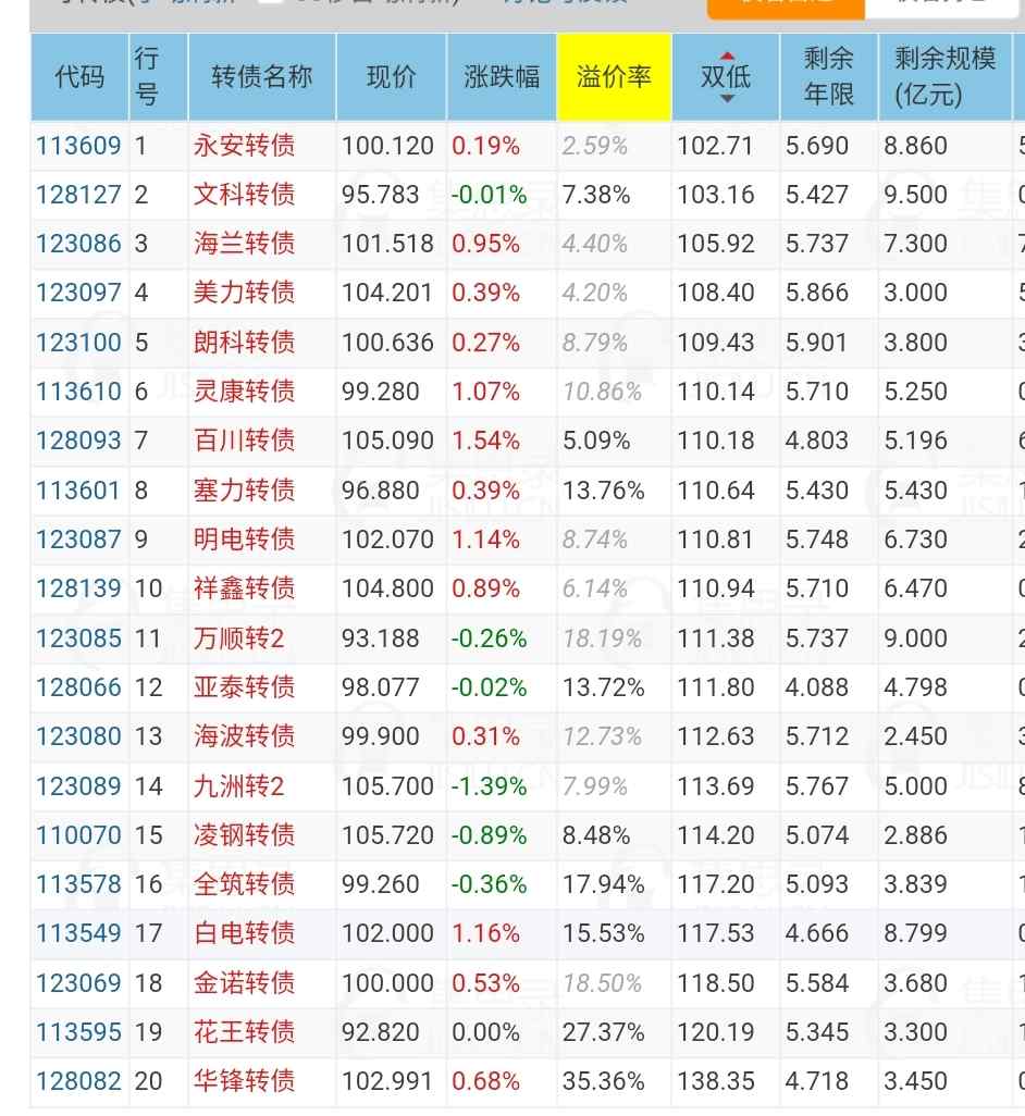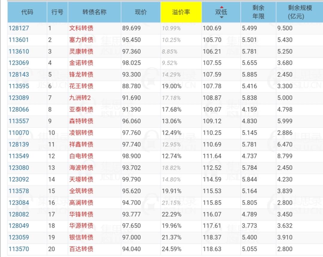 对可转债价格和溢价率*100进行相加,值越小排名越排前。统计结果如下