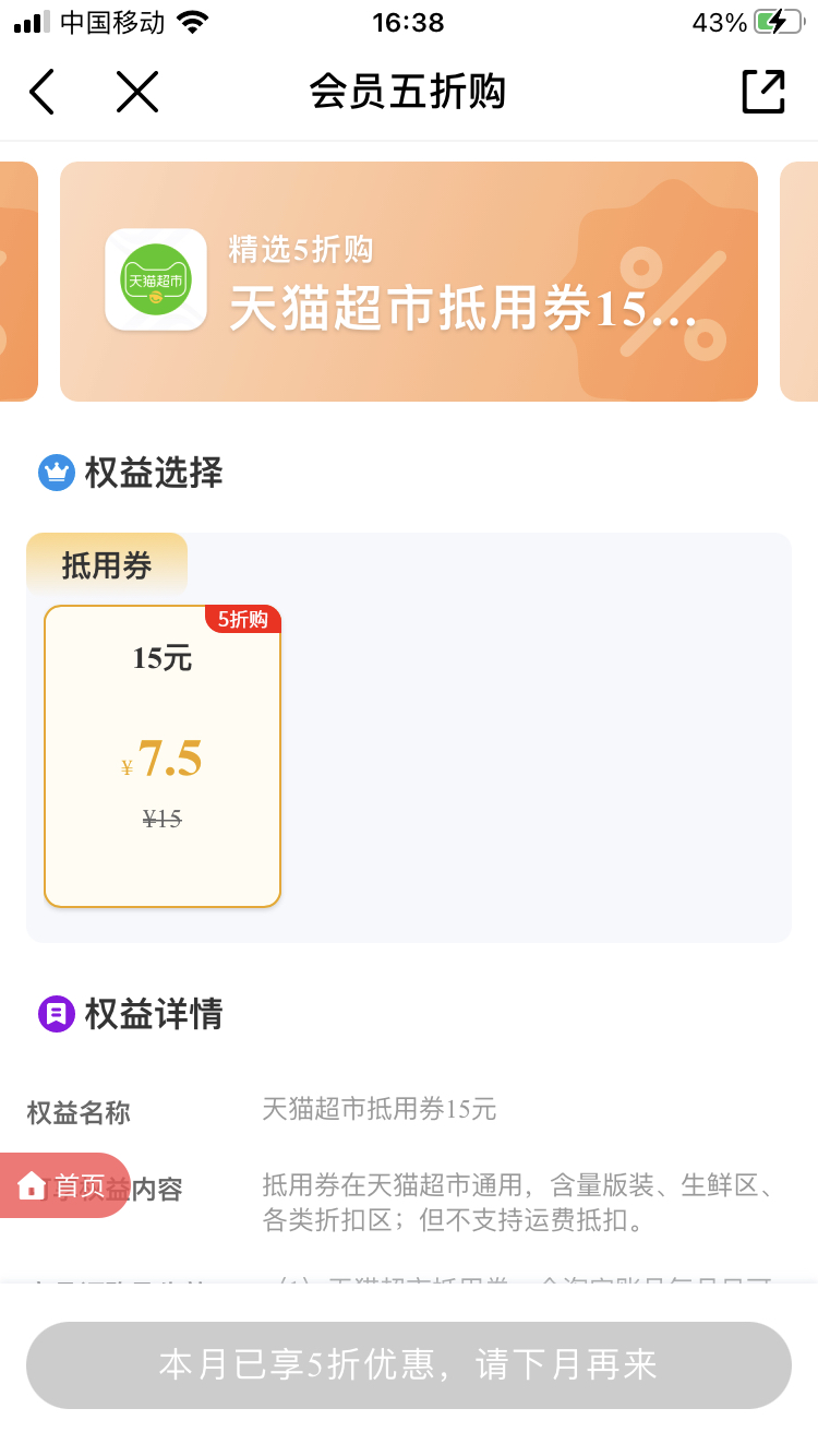中国移动的黄金会员,(我之前免费领了一年,似乎现在没开过的也可以一元开三月)每月可以白嫖一张5元的天猫超市卡之类的。。。