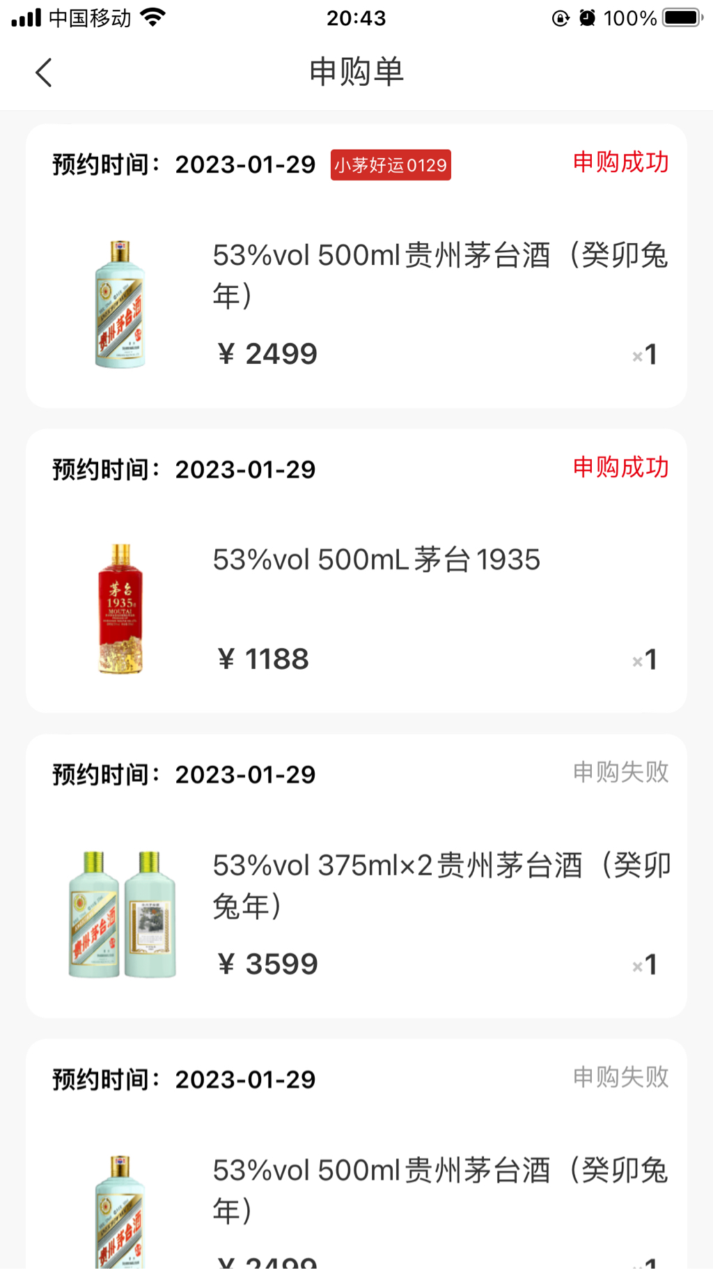 这种看运气的,去年八月份开始,同一店中了三瓶,看看申购的人从两千多到现在一万多人,每次总数只有18瓶左右