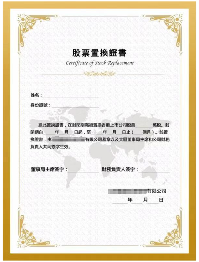 下面这张股票置换证书,为了不必要的麻烦,我把卖股票的大股东名称抹去了,我只能说他卖的是一家香港创业板公司的股票。