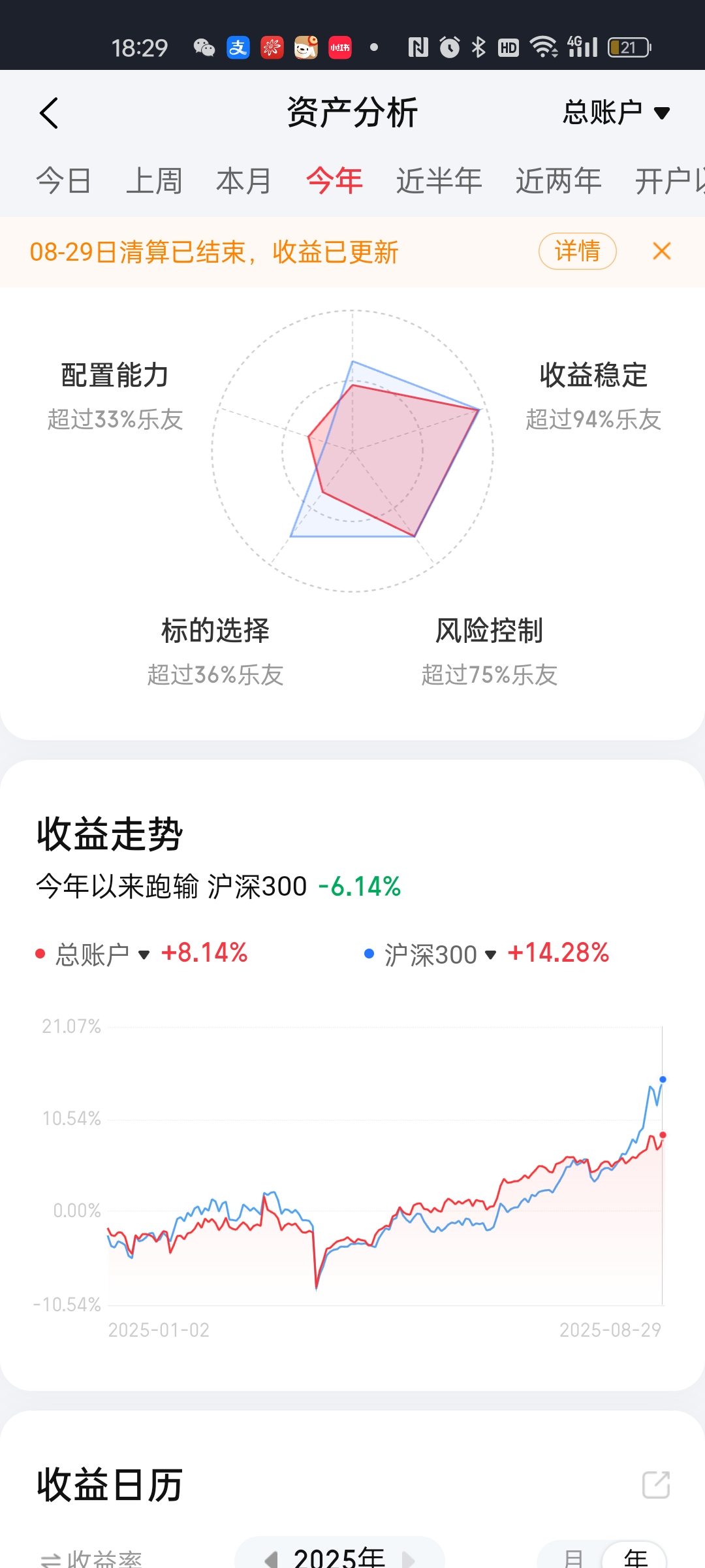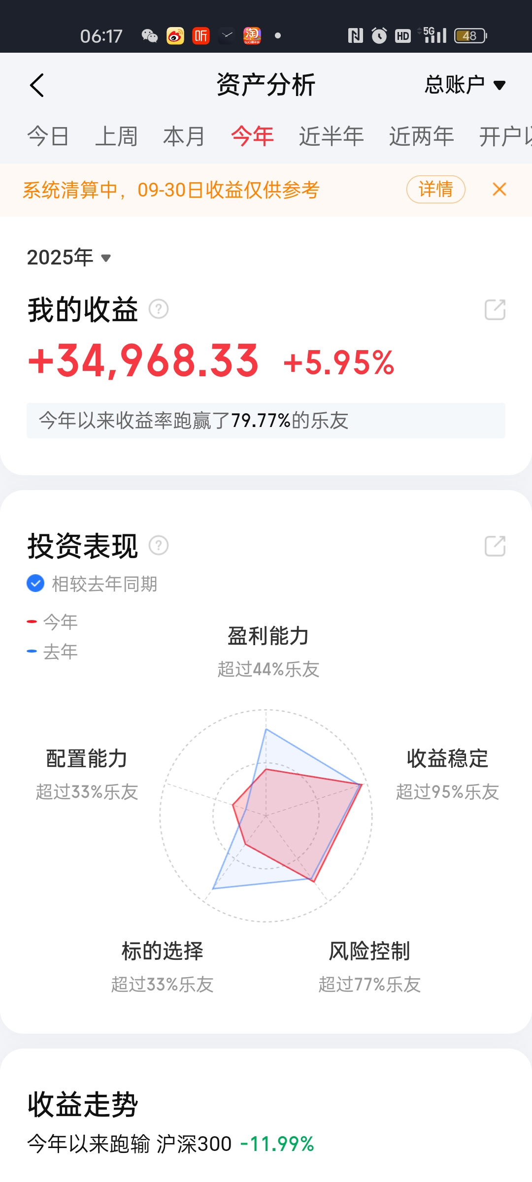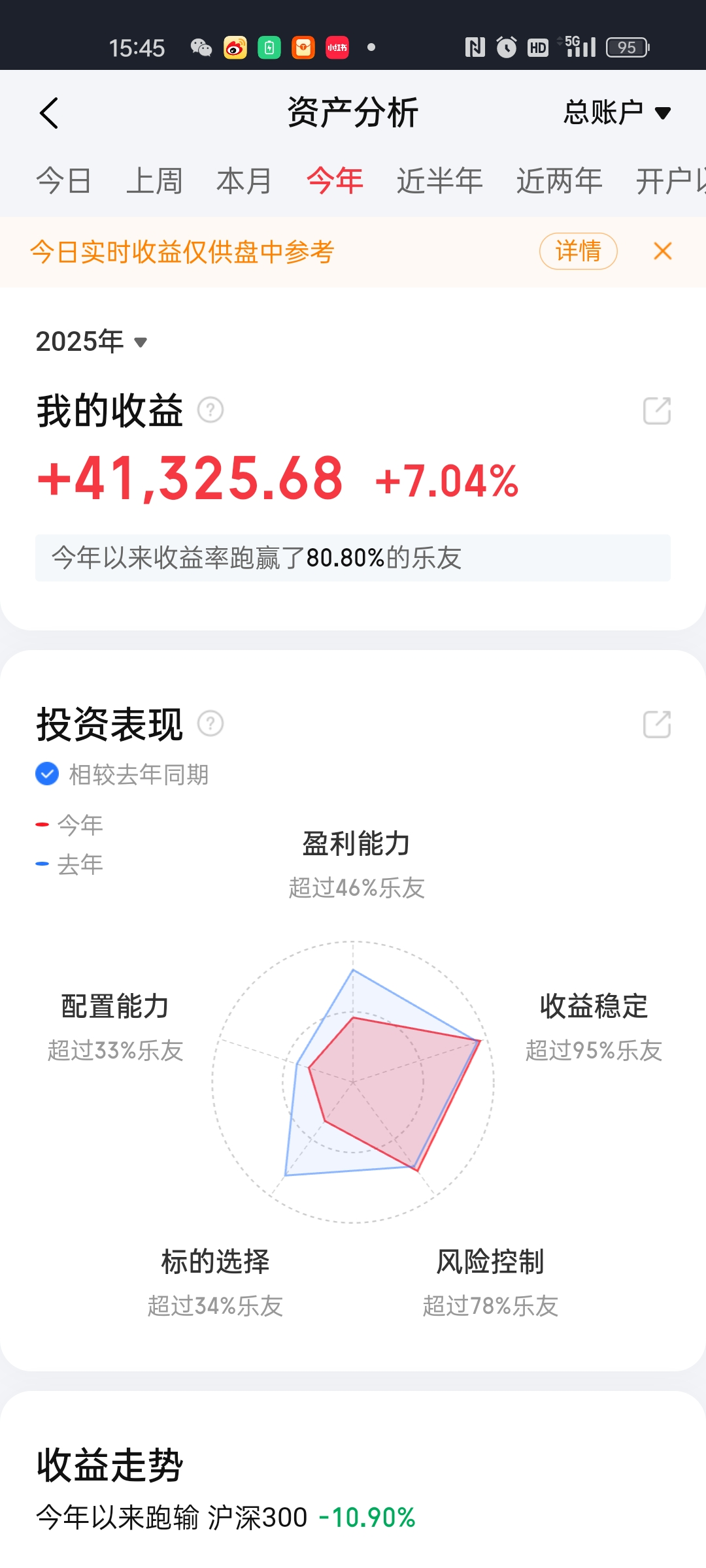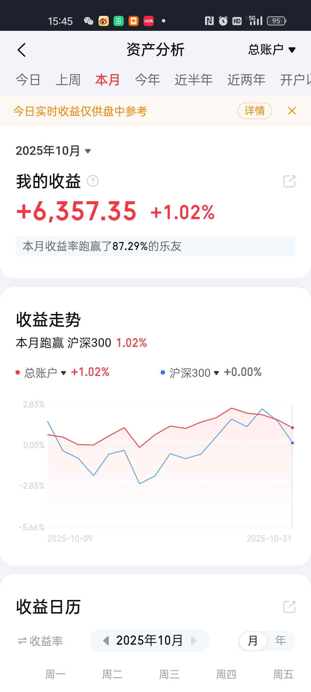 2025年10月收官。本月大盘涨幅1.85%,账户涨幅1.02%。年度收益大盘17.99%,账户7.04%。乐友幸会,为啥我的年收益10.59%只跑赢了77.46%的乐友呢?华泰这算法摸不着头脑的感觉。