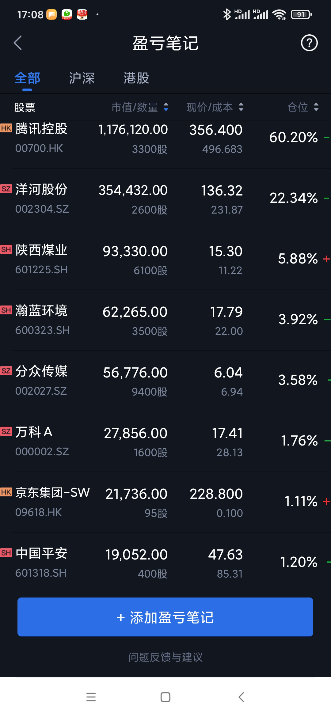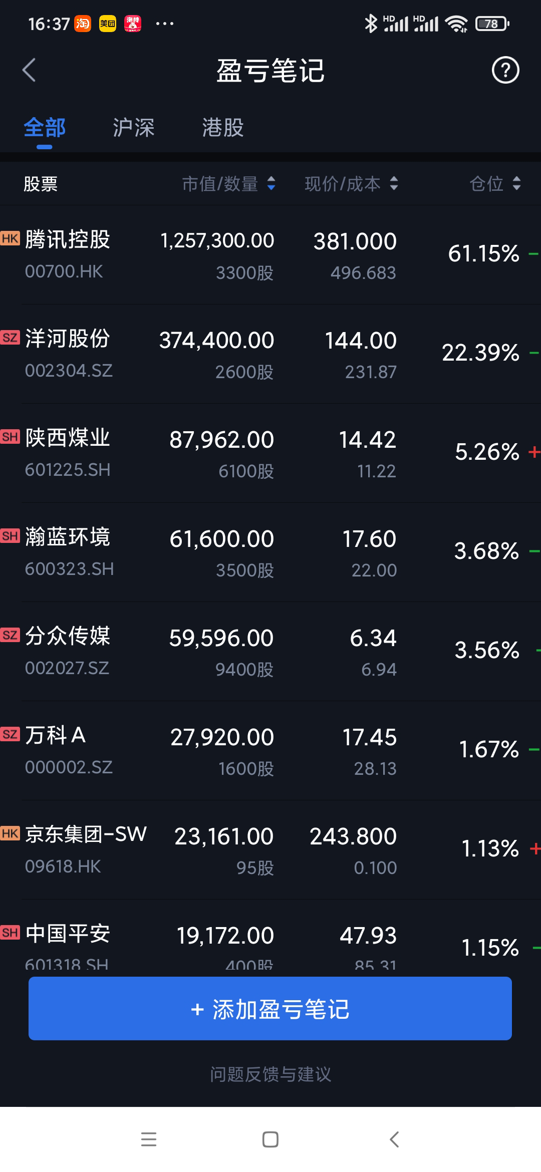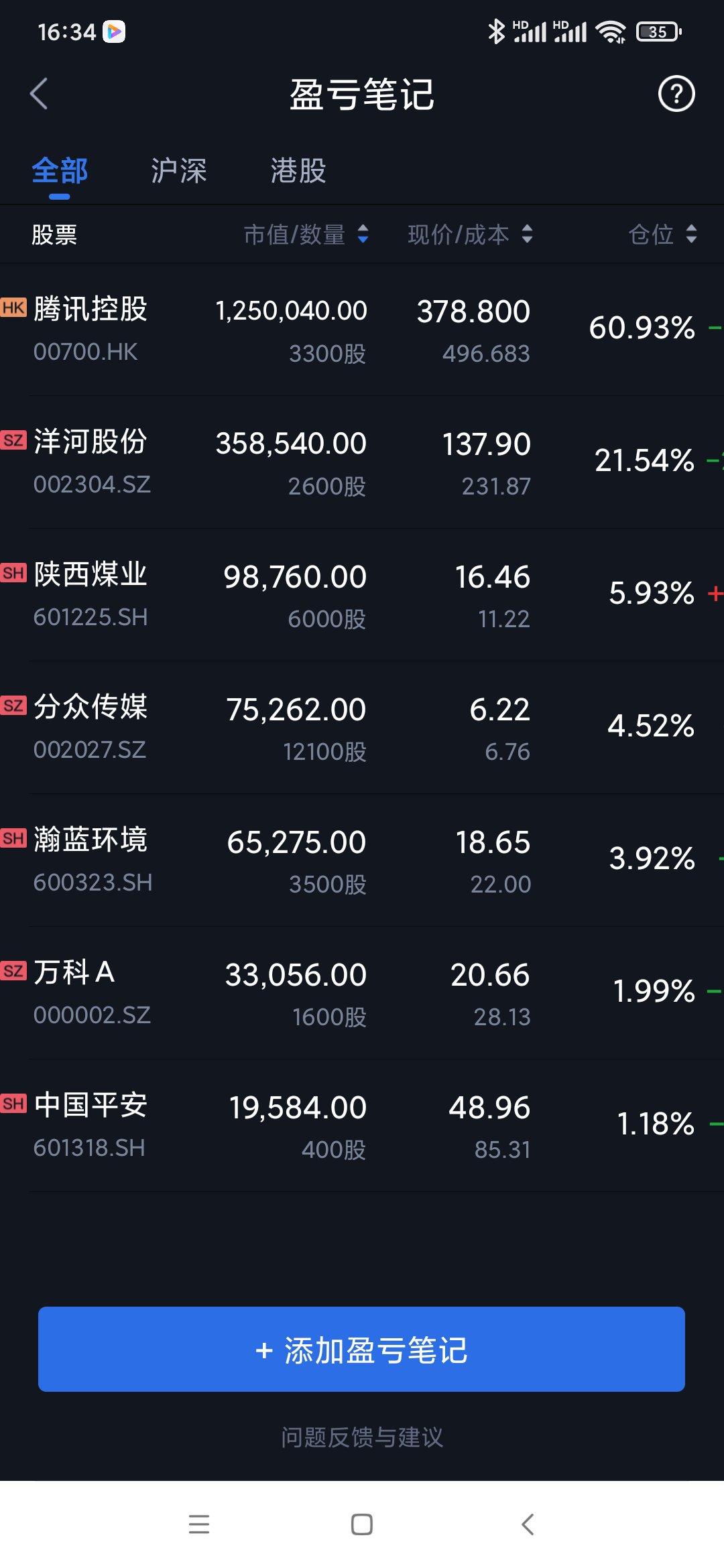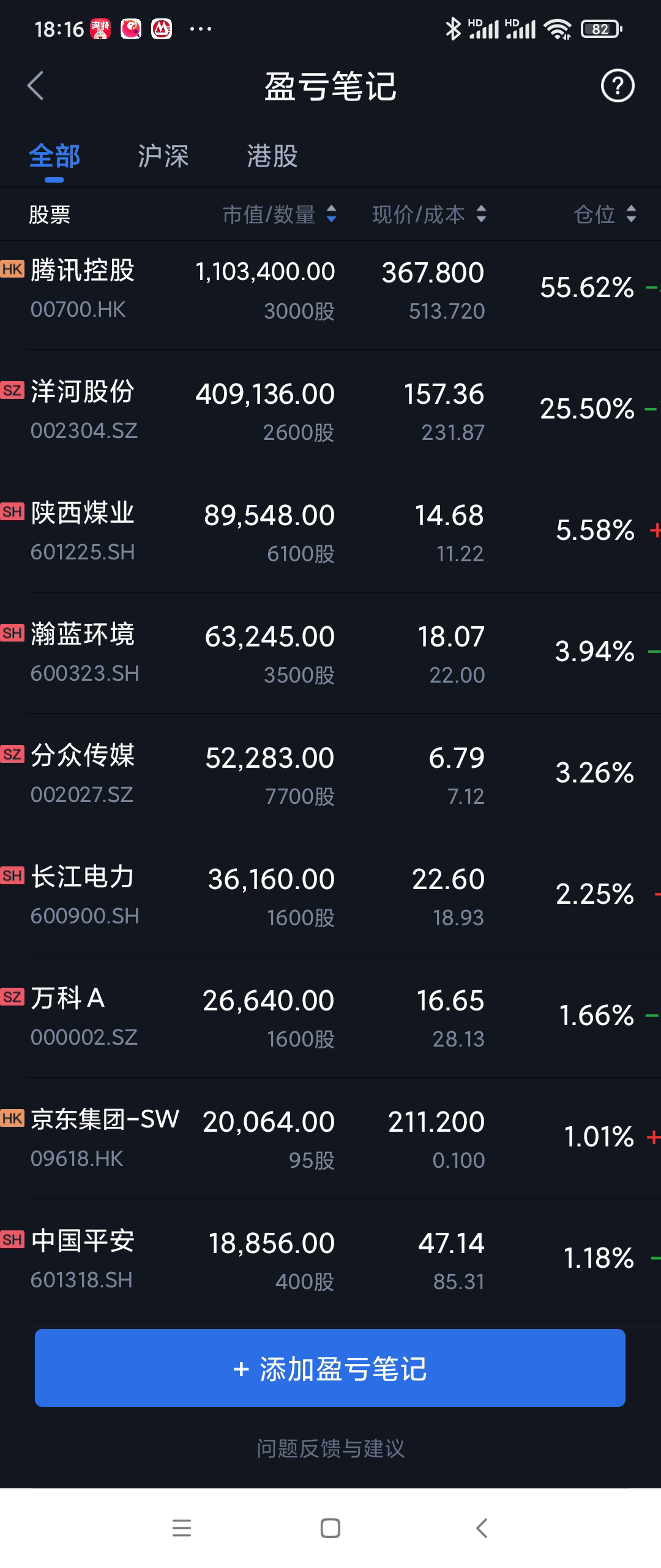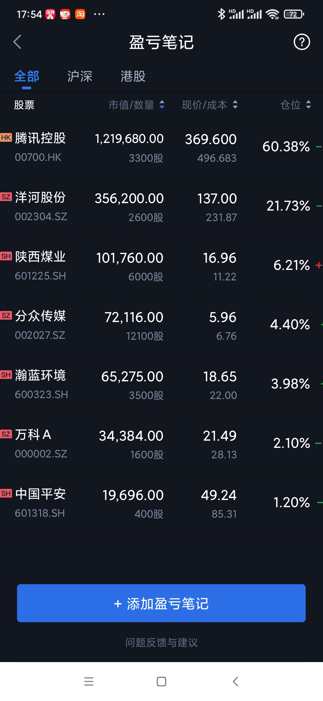 7个持仓4跌3涨。腾讯洋和陕煤分众,占了仓位的93%。跌。瀚蓝万科平安,仅占仓位7%。涨。重仓跌,轻仓涨。哭*。