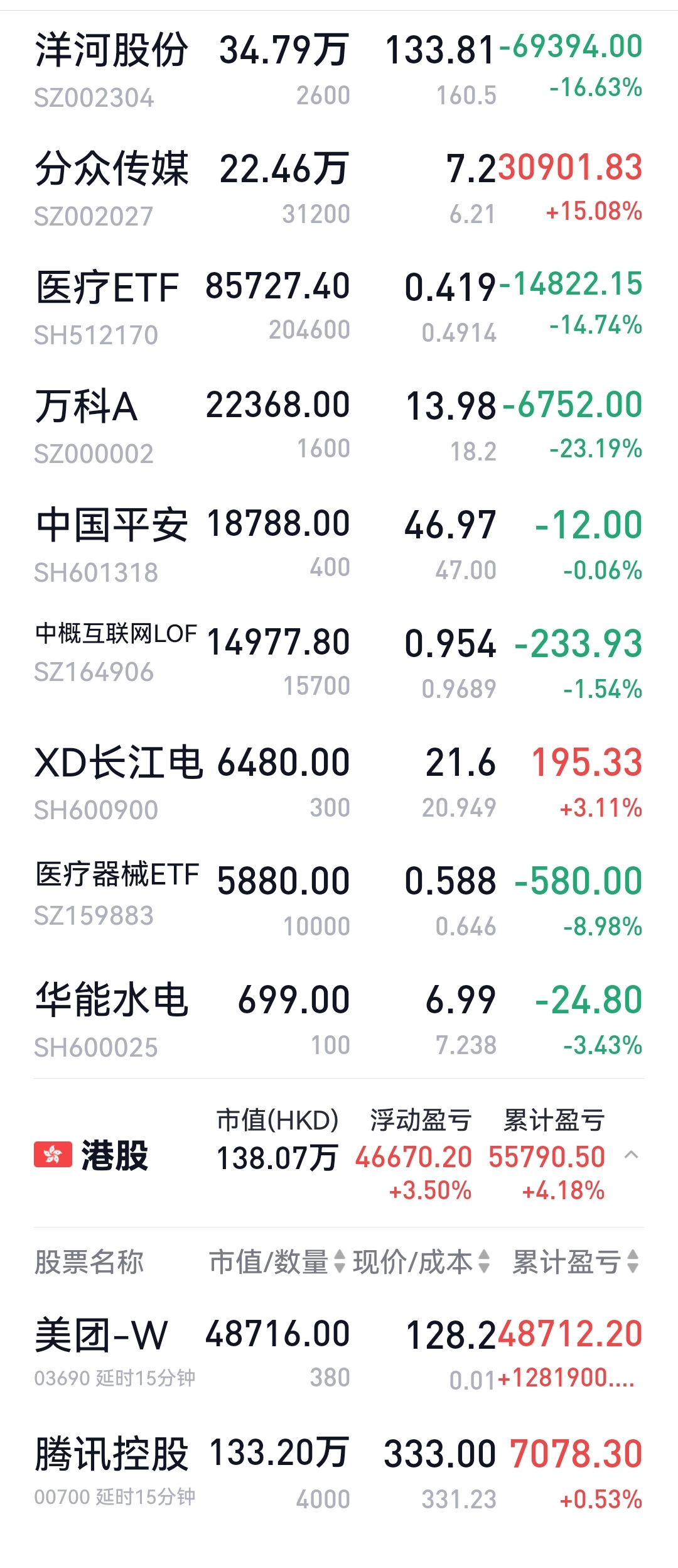一度持仓全红,而且涨幅都不低,最终收盘呢,只有4个红的。其他都变绿了。当然运气不错,腾讯洋河分众都是上涨,保住了1万多的收益。
