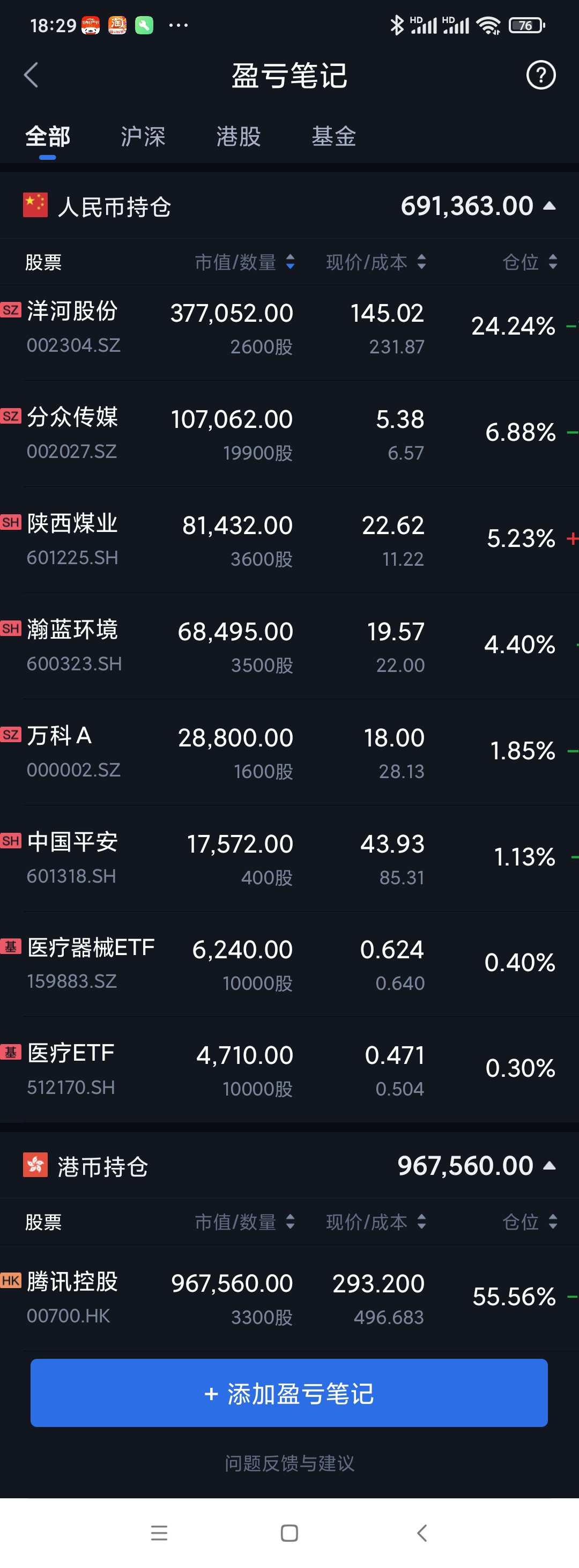 九个持仓无一红盘。除了陕煤和万科没有跌,平盘,其他的全部下跌。腾讯大跌2.52%。收286元创了这一波的新低。洋河下跌0.84%。分众下跌1.1%。医疗和医疗器械继续下跌。