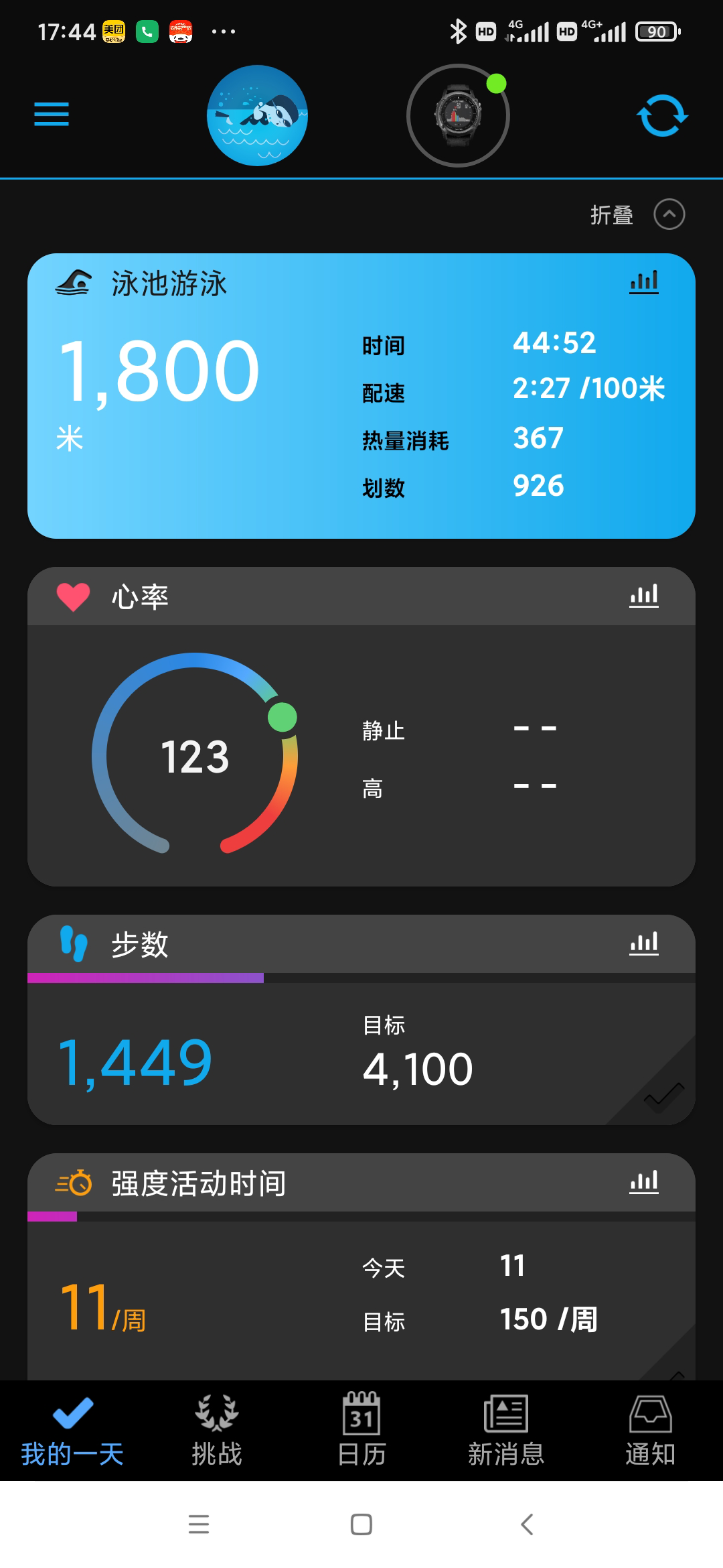 游泳1700米。又有进步。换气的时候注意了低头,头部转动的时候基本在水下,终于领悟到之前我换气依然是会有抬头的状况。自己是不觉得的,现在刻意的压低,将整个头部浸入水中,然后转头换气特别顺畅。转头的同时头部的绝大部分也都在水下。身体在水面的平行保持的更好。滑行起来更加的省力。游1700米的时间跟之前游1600米是一样多的,划水次数也降低了,930次左右的划水,也和之前有1600米差不多。这说明我的划水效率提高了,每50米的划手次数降低了。高兴。下图手表计数是触壁,多计了100米。