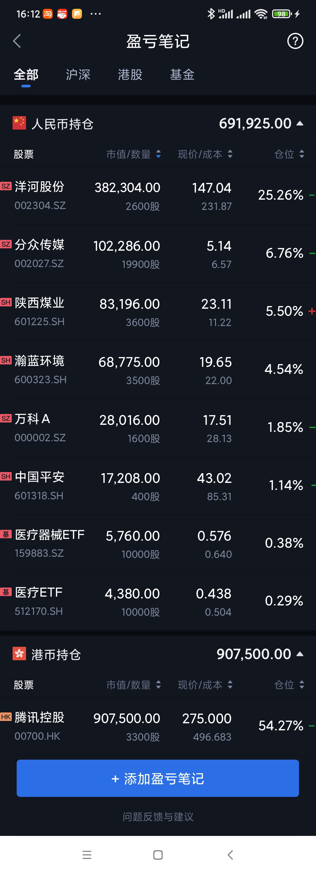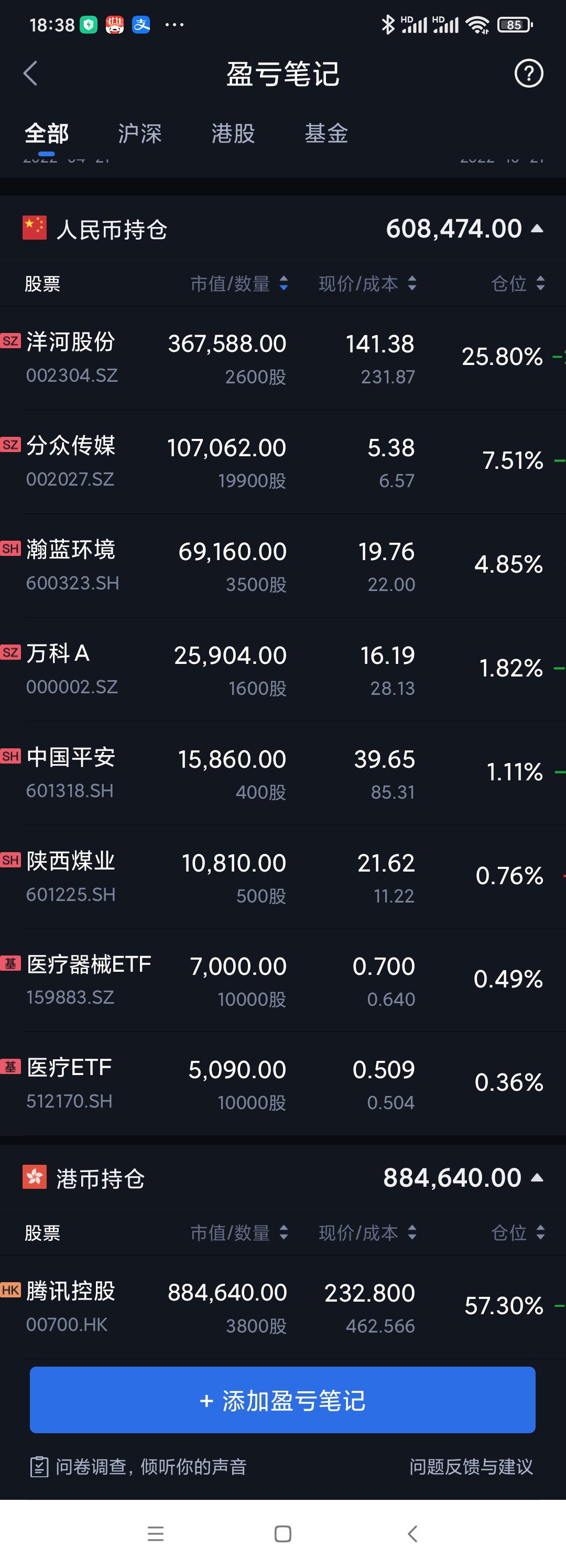现在市值就系与腾讯之上了。将腾讯除开,其他的持仓总体来说今年是盈利的。还是之前说的,恰恰腾讯又是我信心最足的,所以买成了超级重仓。认为最有把握的,最看好的,恰恰又变成“伤害”我最深的。^0^。