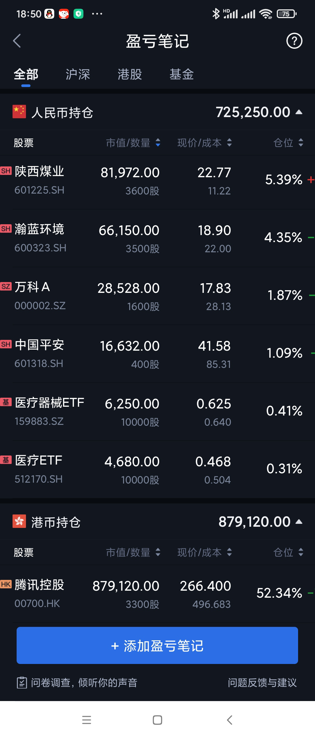跌破300的腾讯很诱人。跌到5.6的分众也很诱人。本月家庭备用金已经攒够了。但是中了一个新股,占用了1.5万。等下个月新入资金在开启定投。陕煤继续等27元以上减仓。