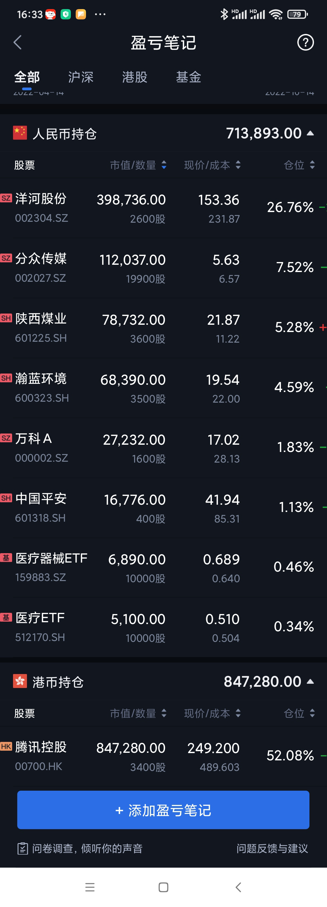 2022年10月17日。周二。今天净值下跌了,13,600元。今年以来累计亏损35.2万。亏损18.92%。净值0.8107。说明一下,追加入金2万。本金从184万到186万。百分比净值就按照新的本金计算。楼主,腾讯打算最高买到多少仓位。