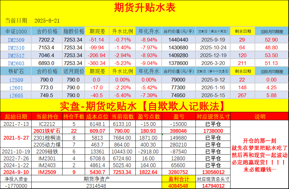 我是按期货的合约价格建仓记录持仓成本,按现货价格计算利润,纯粹为了让自己看得开心,所以自嘲为自欺欺人记账法,能持有到期的话,结果会和按期货合约价格记账的效果一样。一方面让自己看着舒服,一方面让自己能够以更长远的眼光看待价格的短期波动。