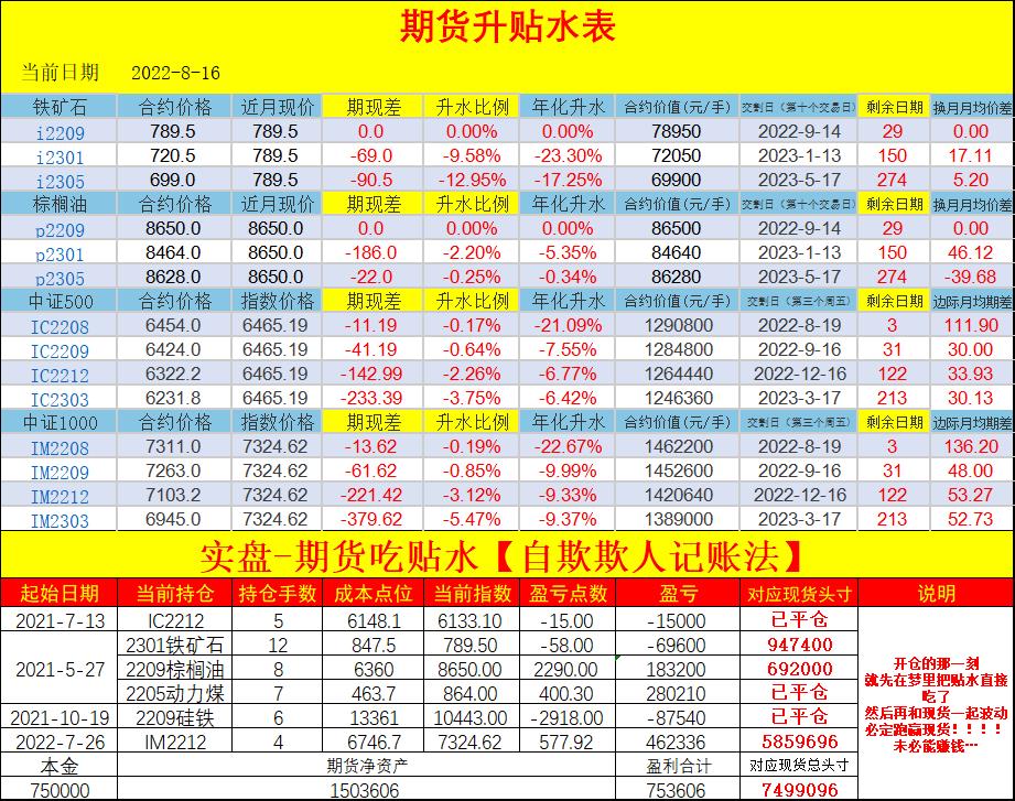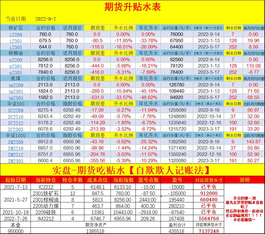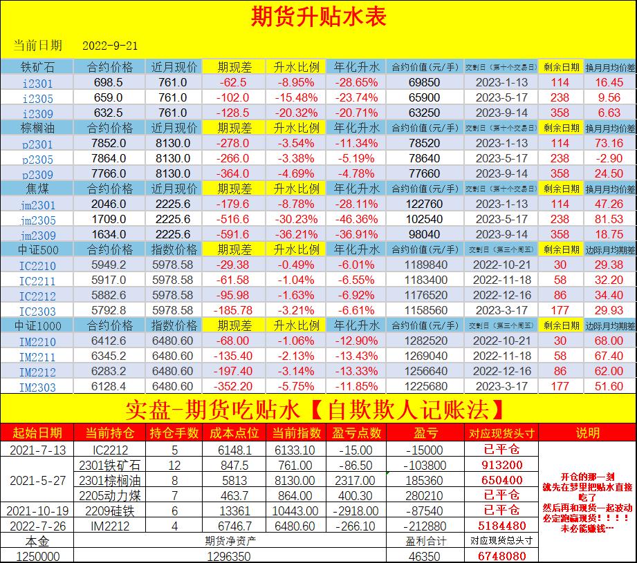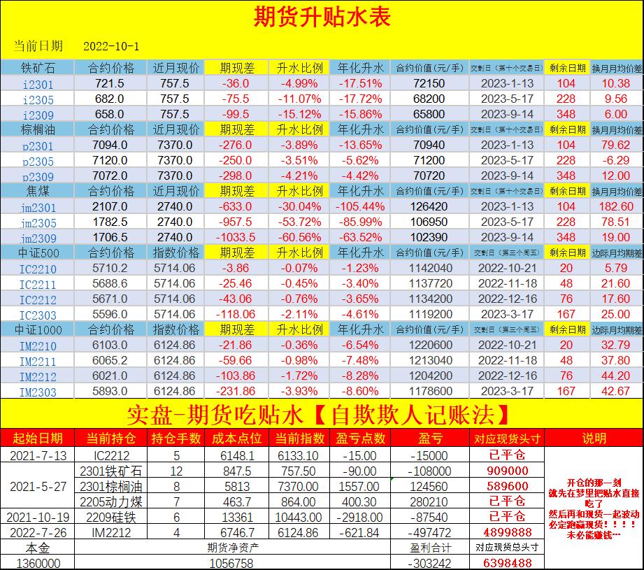 我是按期货的合约价格建仓记录持仓成本,按现货价格计算利润,纯粹为了让自己看得开心,所以自嘲为自欺欺人记账法,能持有到期的话,结果会和按期货合约价格记账的效果一样。一方面让自己看着舒服,一方面让自己能够以更长远的眼光看待价格的短期波动。