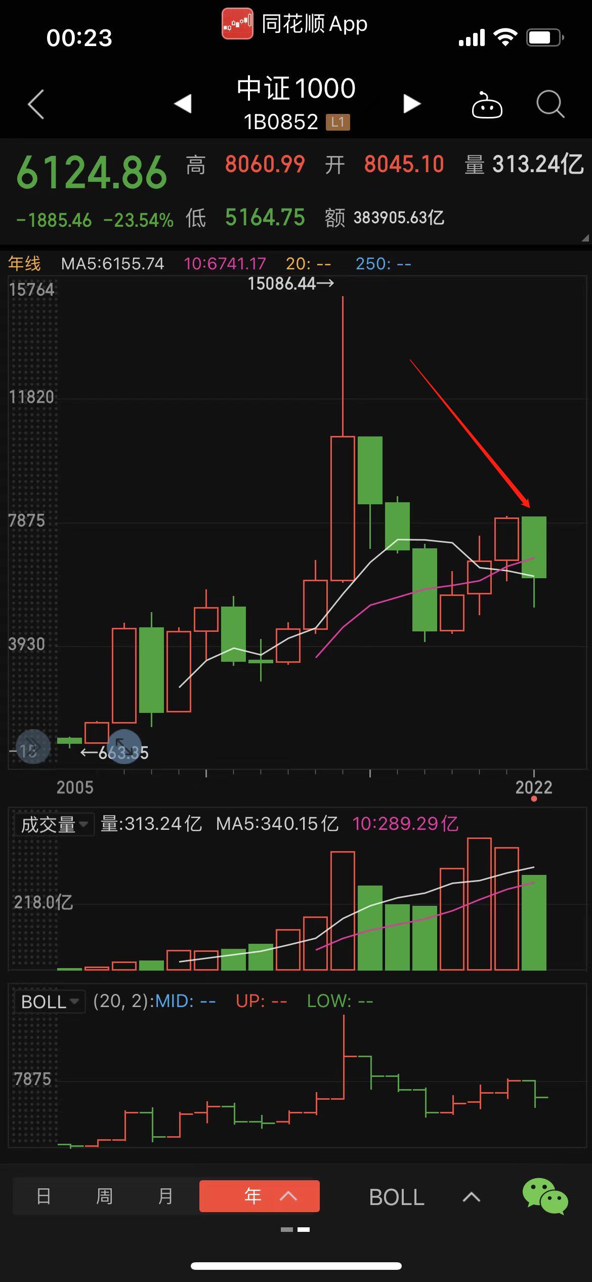 你们说今年这个中证1000的K线和往年有什么独特之处呢,创新低了?创新高了?都没有,很平常,很平凡。就连这-23.54%的跌幅,在所有下跌的K线里面,也只是排在了中间的位置。我想看这个帖子的人里面,应该有很多朋友跟我一起吃贴水,最近行情大家也许会比较郁闷,但是放眼历史长河,太多情感真的没有必要。