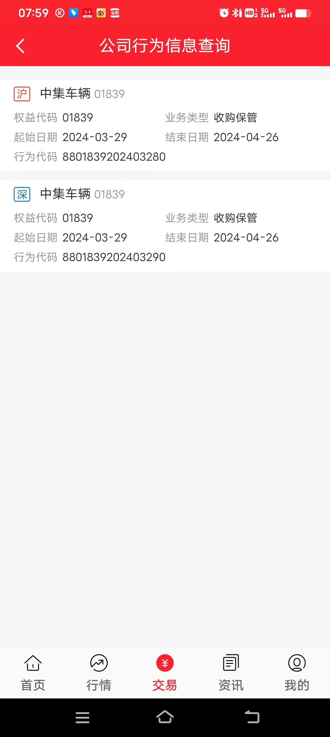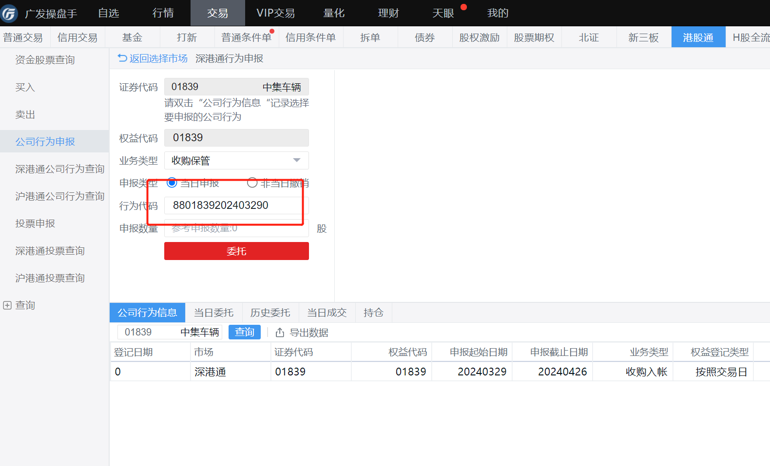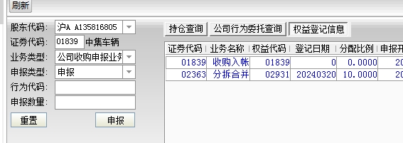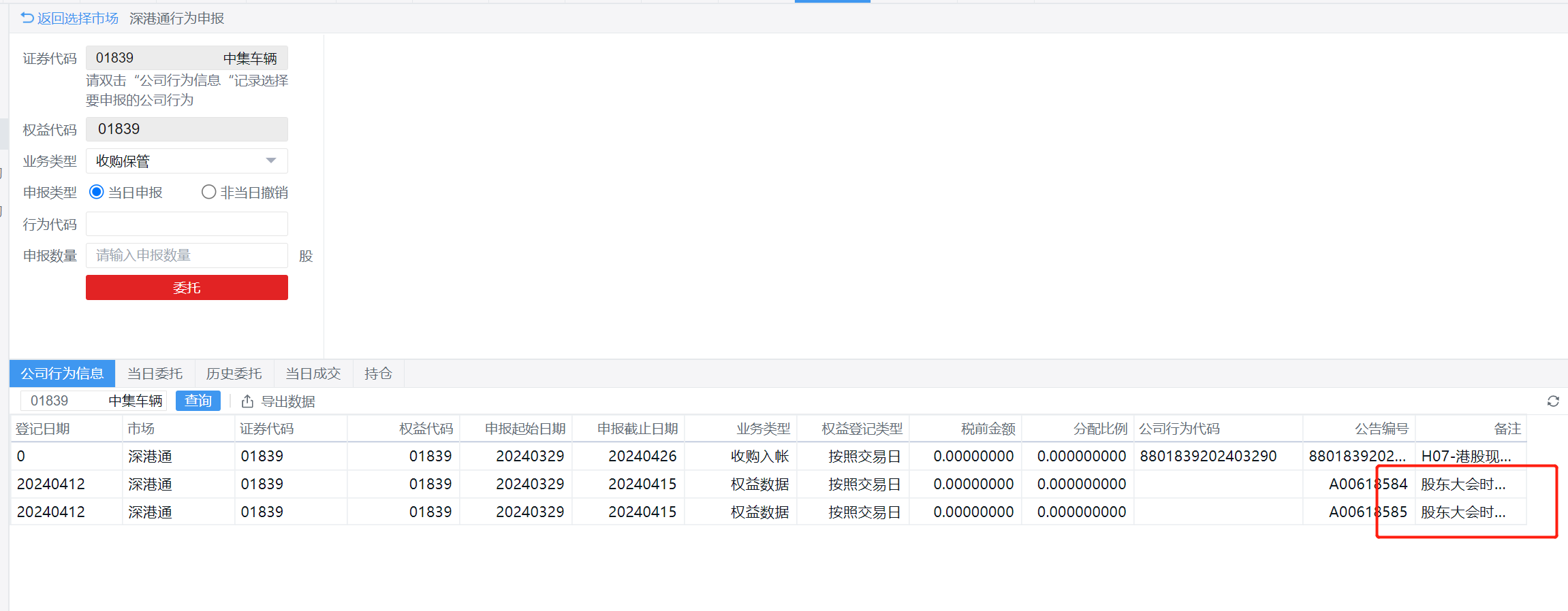 孔大,关于中集汽车要约想请教一下您:应该可以不用寄文件,通过港股通的公司行为申报就能操作了。华泰通达信软件上已经出来了,公司行为代码8801839202403280,时间2024.3.29 - 2024.4.26。