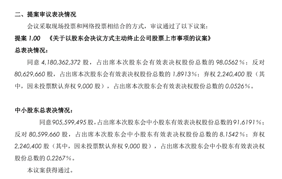 它的筹码成本结构对投票并不有利,毕竟停牌前还长时间的在3-5元,这一复牌就一路板的跑到1元多, 然后没几天,就要1.6元收走退市,没有给场内充分消化认同1元多这个事实的心理接受期。所以,只要事件发酵被广而告之,停牌前就持仓的股民参与投票数起来的话,这些人绝大多数会投反对票的。