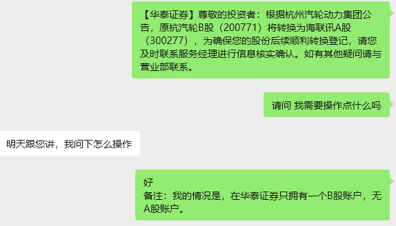 【华泰证券】尊敬的投资者:根据杭州汽轮动力集团公告,原杭汽轮B股(200771)将转换为海联讯A股(300277),为确保您的股份后续顺利转换登记,请您及时联系服务经理进行信息核实确认。如有其他疑问请与营业部联系。跟你一样,