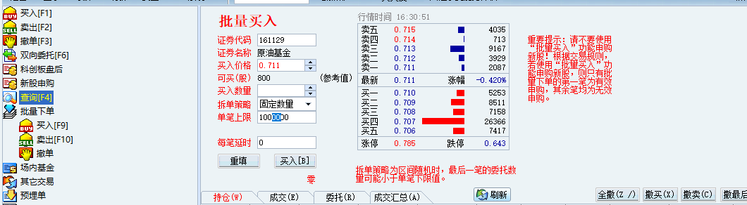 请教一下,请问怎样能做到同一时间下同时委托5张100万的单呢?