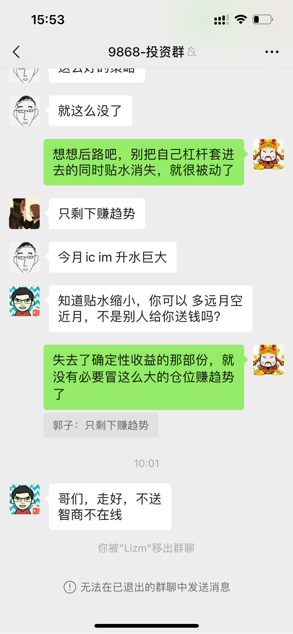 昨天在有个贴子里说过,但不可见了。在此也说说跨期。有人觉得IM当月升水了,远期还有贴水,于是想出了一个空当月,多远月的想法,初一看,好像是既能吃当月溢价,又能吃远月贴水,是个好主意。其实有观察跨期差的集友都可能有留意到,若贴水恢复到常态(至少这六七年是这样),当月贴水七八十个点,那么远期贴水变得更大,远月减当月的差更大了,那么空当月多远月就会亏损严重。当然,你可以赌跨期差变得更少更少,甚至远期溢...蛋总说的是,投资最怕的是路径依赖,某些所谓的大v自以为是,听不进别人的意见,一根筋,还说什么多近月空远月这种主意。其实风险很大。能做到这么轻易赚钱的事,又何必来吃贴水。还开课收费割粉丝,还轻易T人,真是服了。这种群有多少退多少,一点意义没有。