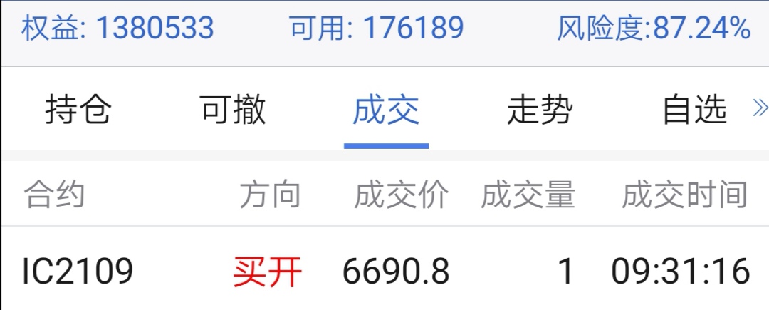 趁还没跳水上来更新下,开盘加了一手IC。还剩两手等放量大涨或者对2863是大底有绝对信心再买,本来昨天开盘就想买的,见老美暴跌,500低开贴水继续变大就没买,想等更美的价格,盘中涨起来更不想追了。那几天暴跌时,你补保证金了吗?