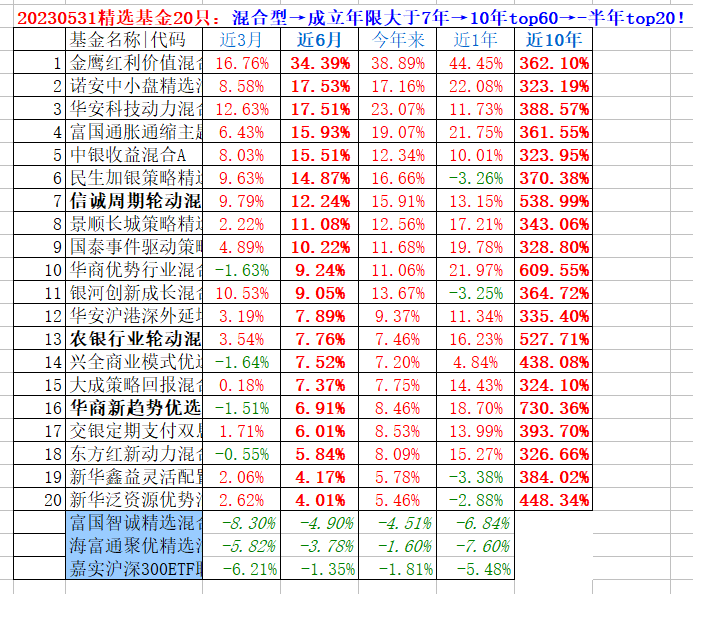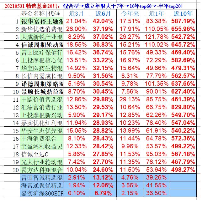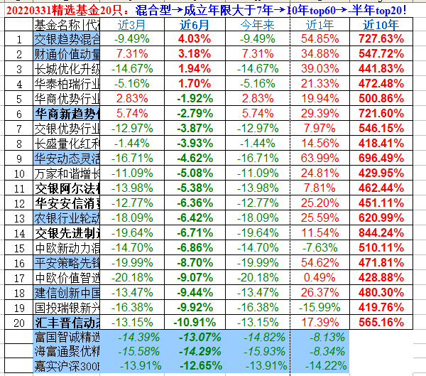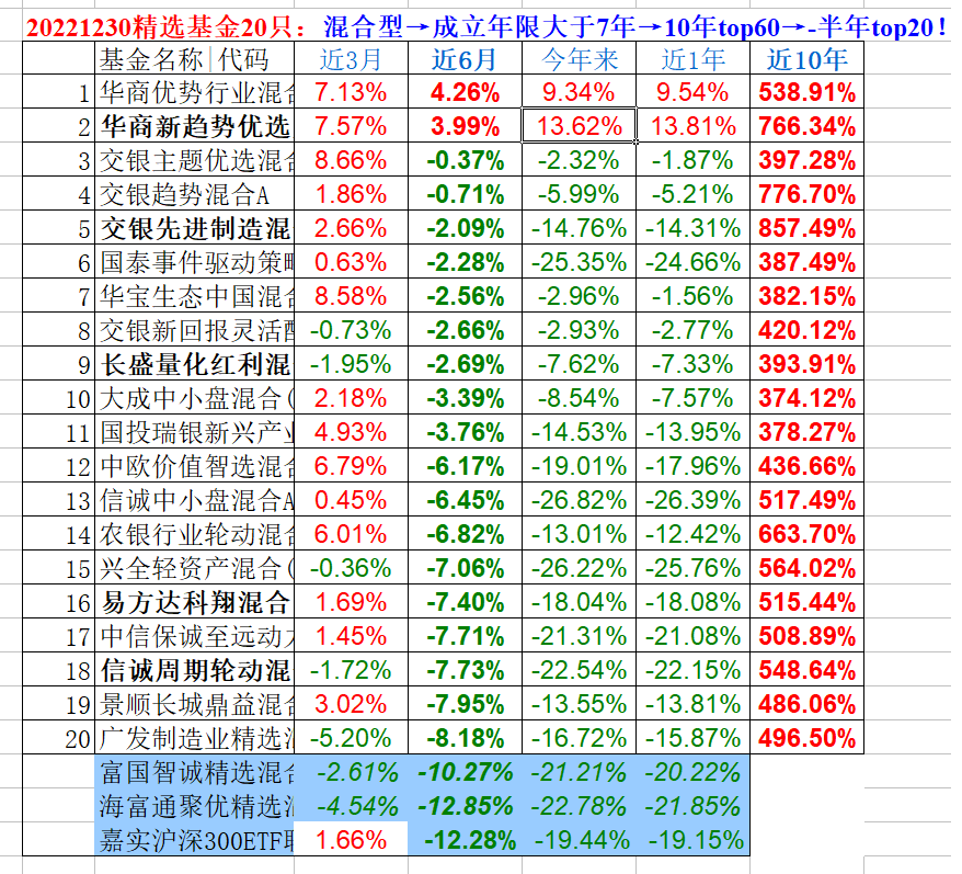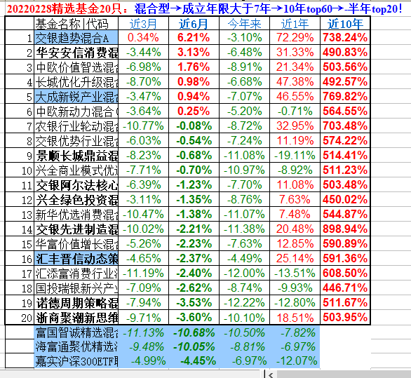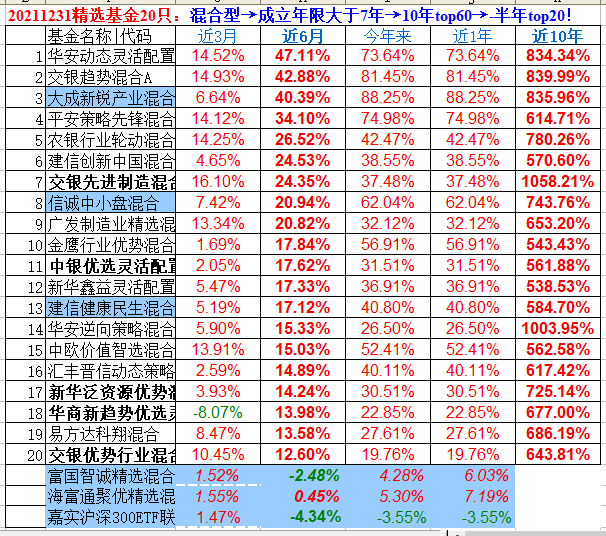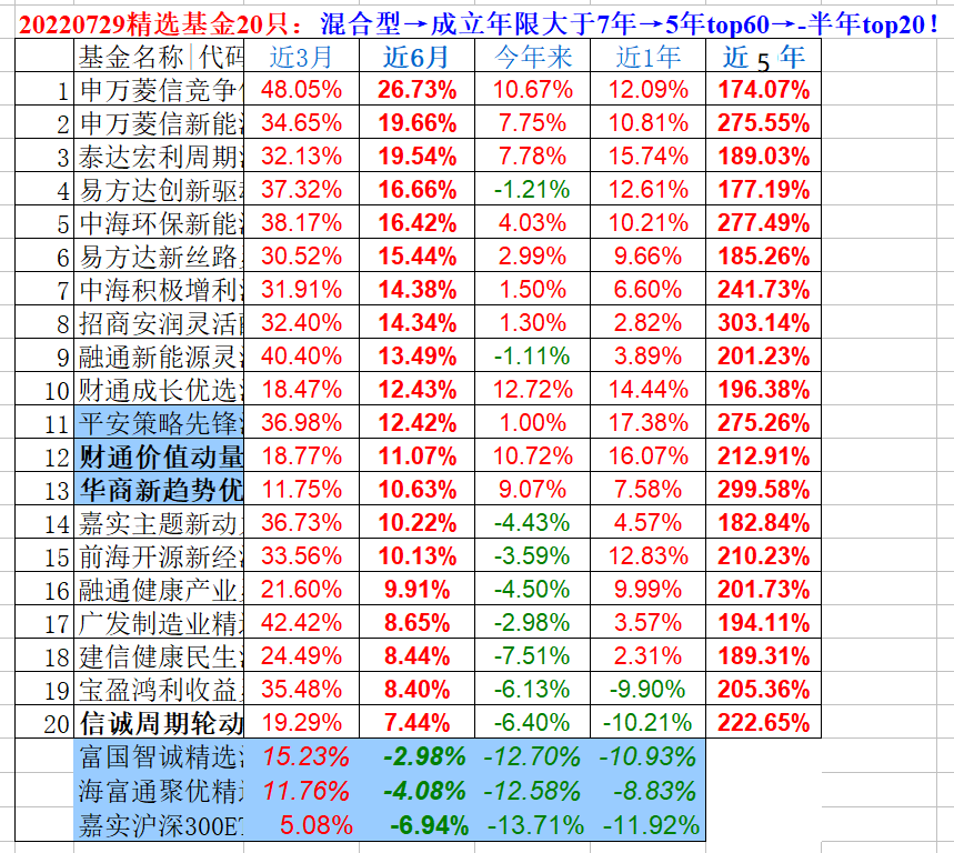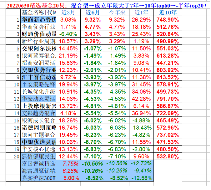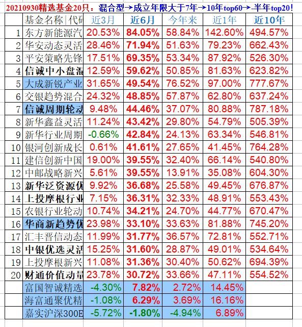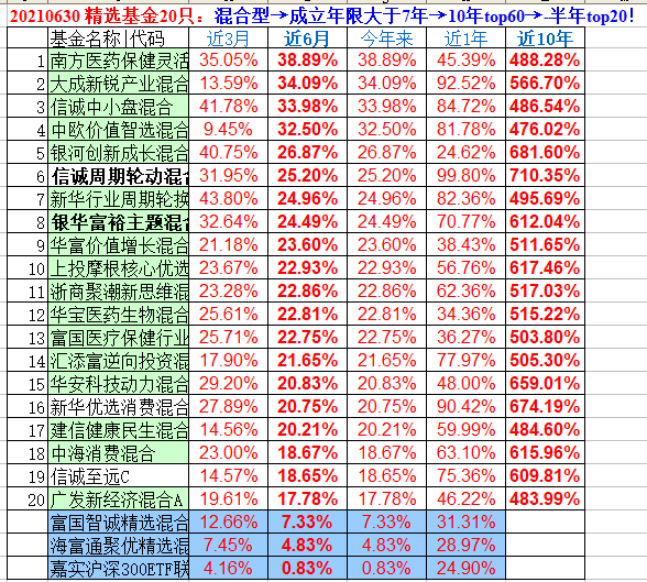分享精选基金20只:混合型基金→成立年限大于7年→10年top60→半年top20!