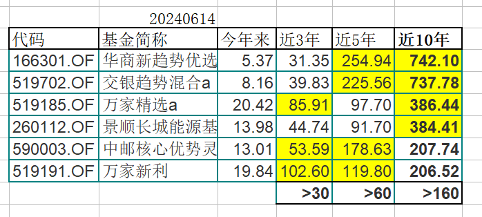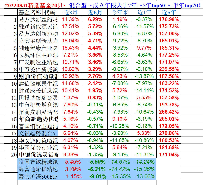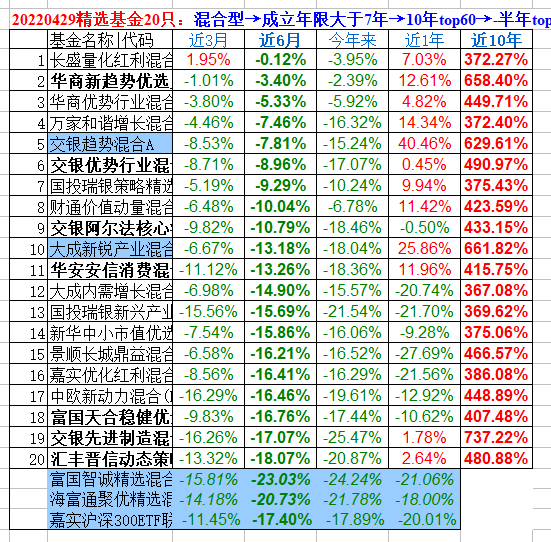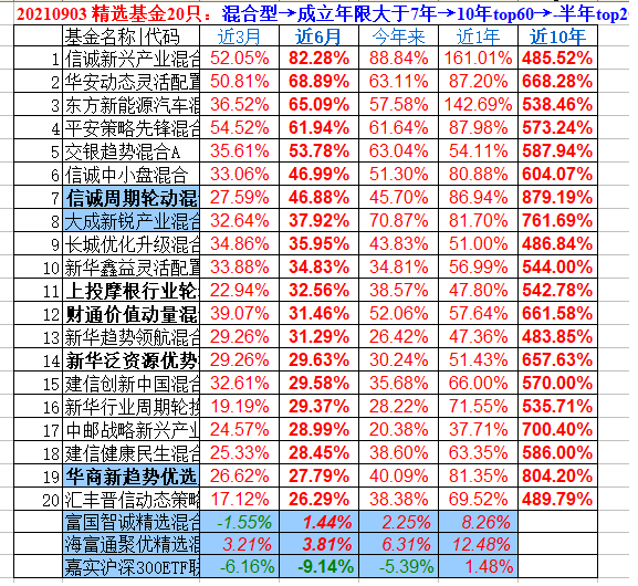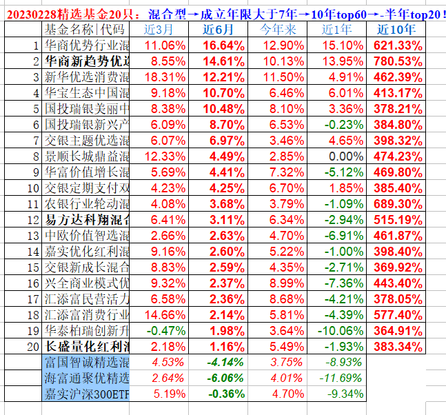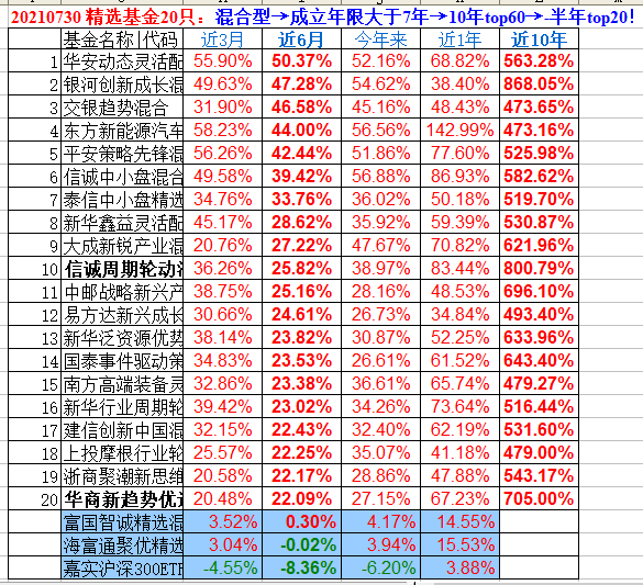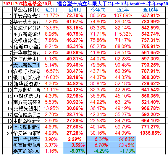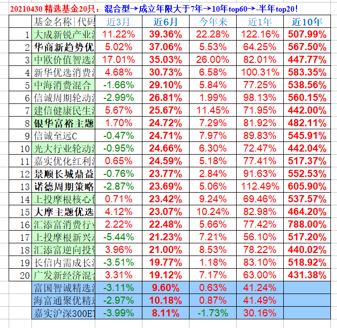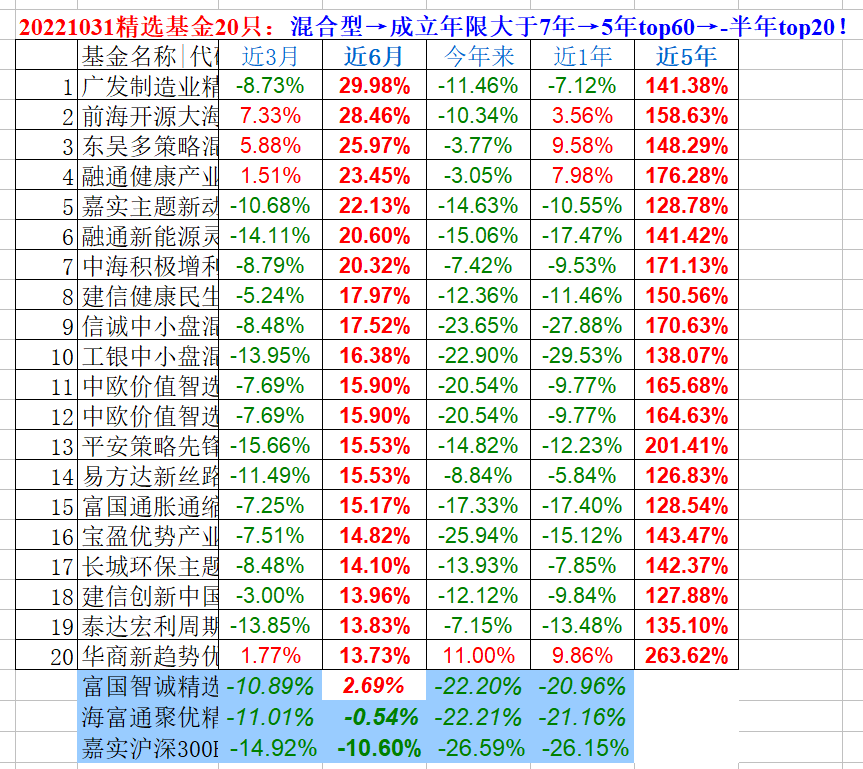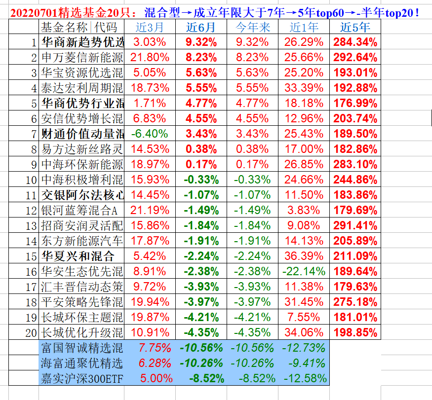 分享精选基金20只:混合型基金→成立年限大于7年→10年top60→半年top20!