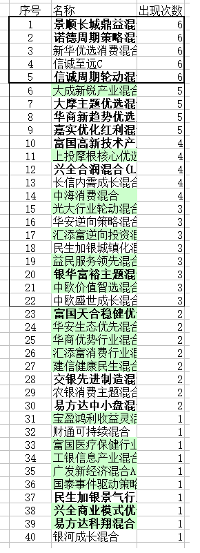 2020.12.16-2021.05.31,每月精选基金20只,6个月共120只,扣掉重复出现,其实就这40只在表演(绿色底色是2021入选,黑体是持有或曾经持有过)。