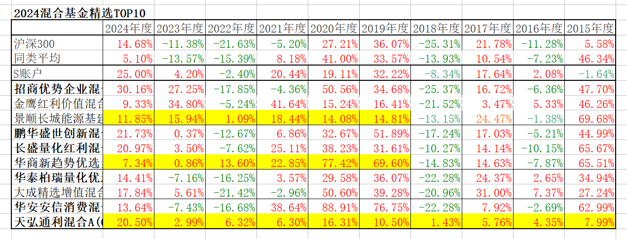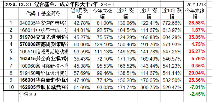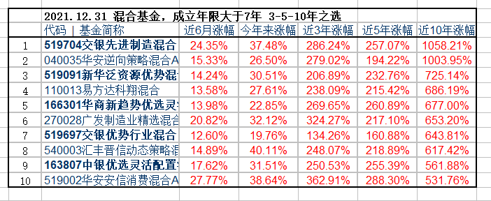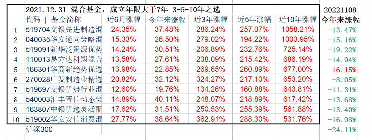 精选混合基金:成立年限大于7年,10年增长大于300%,5年增长大于100%,3年增长大于50%,最近半年增长跑赢沪深300