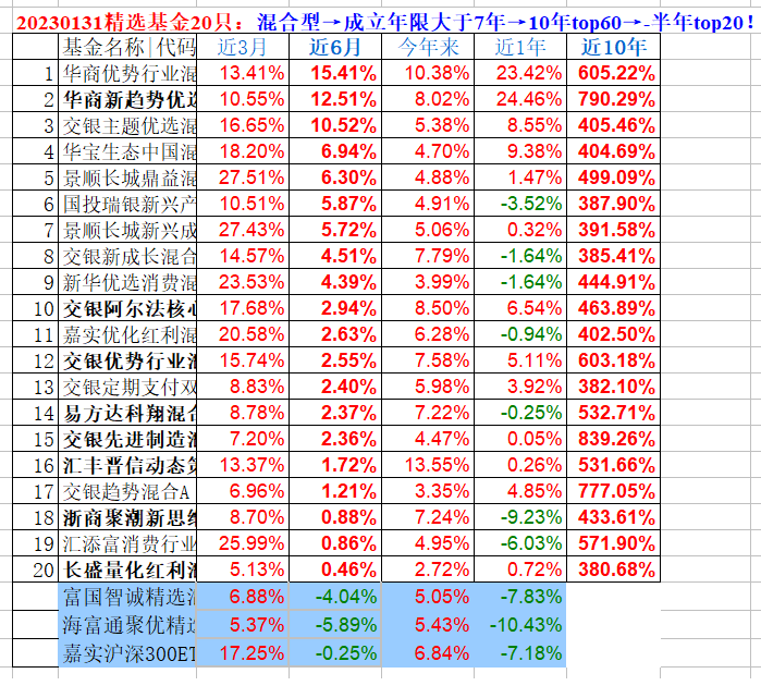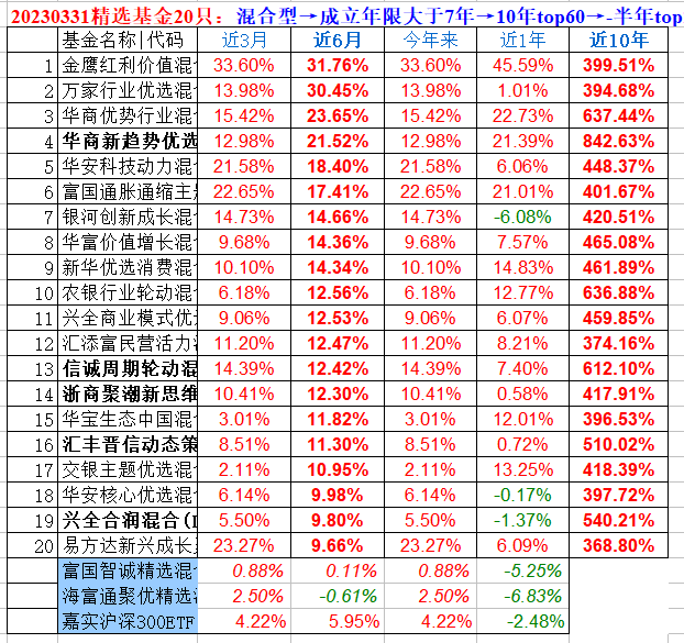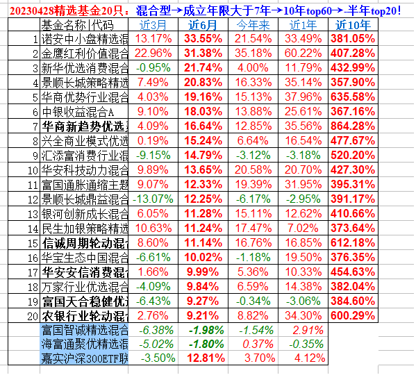 分享精选基金20只:混合型基金→成立年限大于7年→10年top60→半年top20!以最近半年沪深300 / 海富通聚优(FOF) /富国智诚(FOF)为基准,每季度更新。20230428选基情况(上证指数3323),混合基金7396只,成立年限大于7年1382只,最近10年增长大于300%的114只,最近5年增长大于100%的211只,最近3年增长大于50%的267只,,,,
