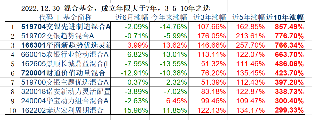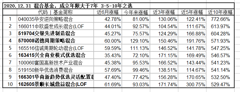精选混合基金:成立年限大于7年,10年增长大于300%,5年增长大于100%,3年增长大于50%,最近半年增长跑赢沪深300,,,