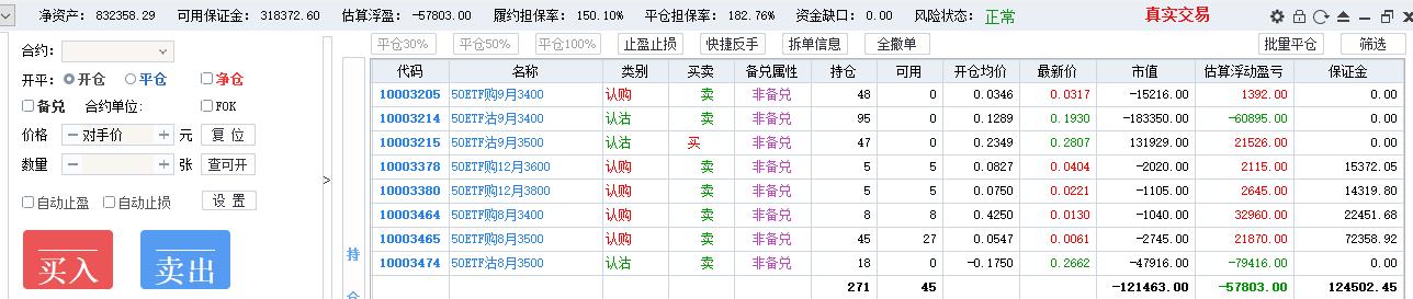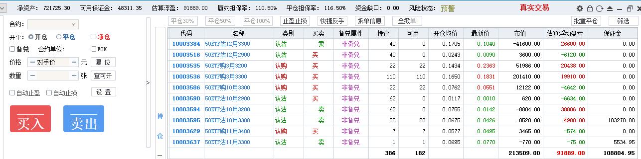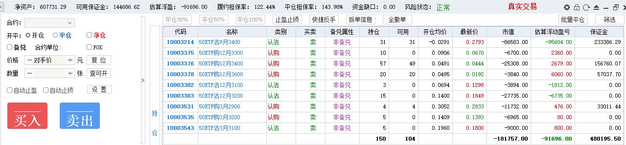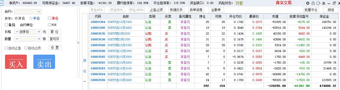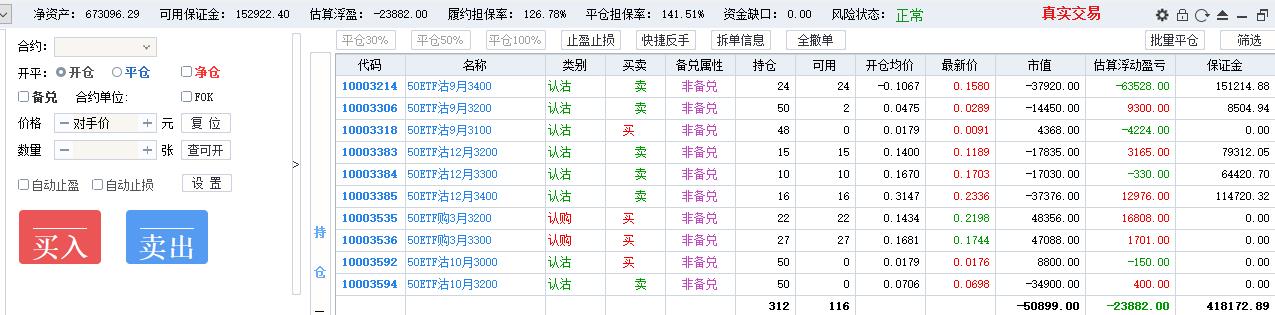 操作风格没有固定,摇摆于双卖与卖沽、全仓短线、全仓卖购之中,前期双卖抵抗,现货单边下跌,变成单腿卖沽,损失惨重,7月初买沽做空净值一度回本,回到双卖,无奈现货继续下跌,10月赌单边开了200张卖购,10月22日现货反弹4%,单日亏损16万,保证金风险度125%,券商电话过来要求追加保证金否则强平。最终自己操刀平掉120张卖购,加开80张卖沽做多,第二天现货跌3%遭遇双击。全年最终亏损。