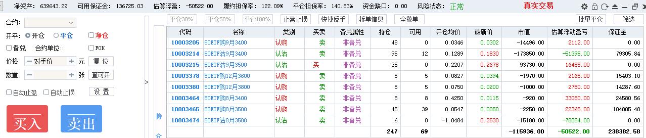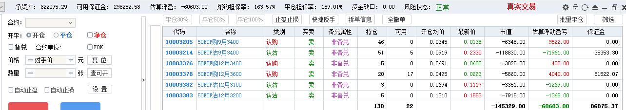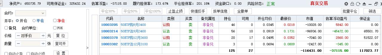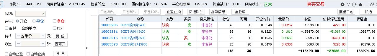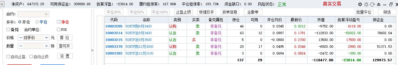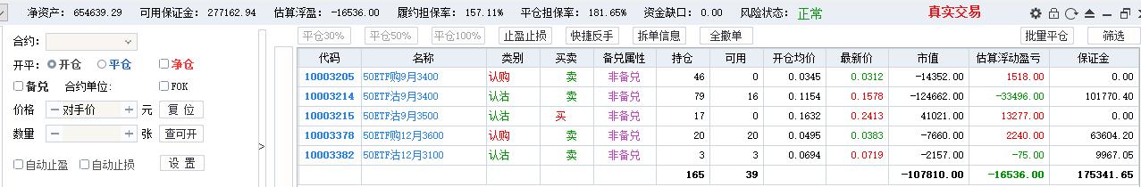 周六思考:50期权当月卖购张数太多了,需要往后移仓收编,缩减张数,降低保证金占用,防御风险,下周一先不处理9月卖沽,把八月卖购与12月3800卖购全平了,换入15组12月3600卖购