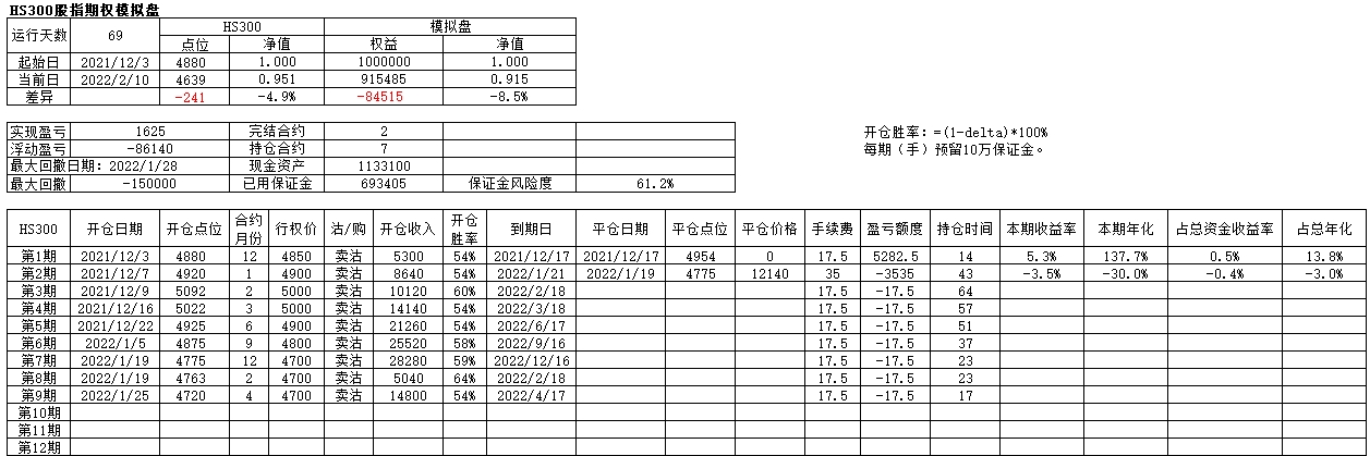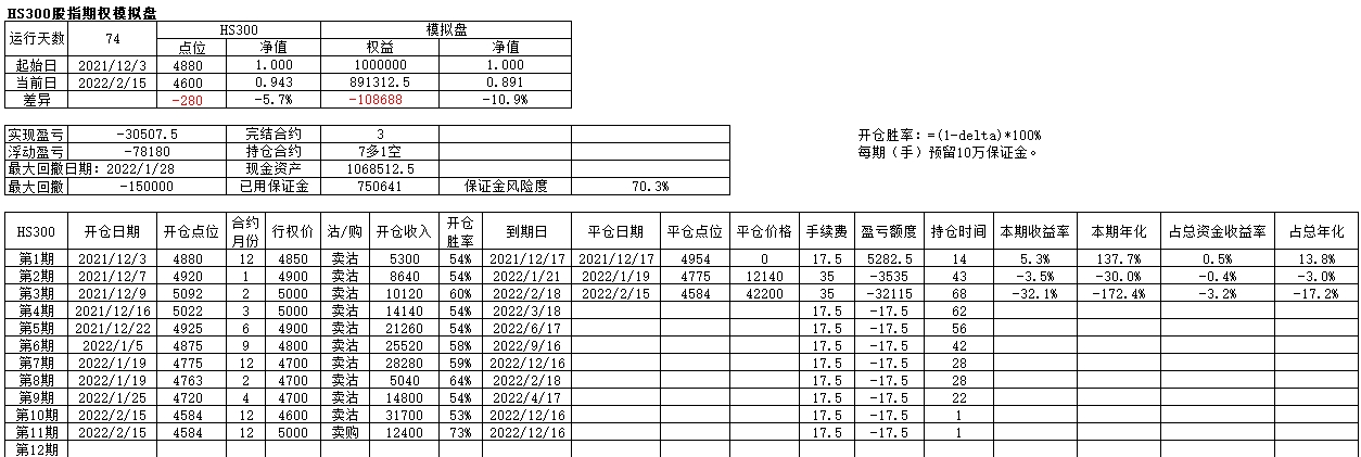 2022年到2/10为止 亏损17.5万,净值0.735。当前持仓 delta 92,折合仓位391%。
