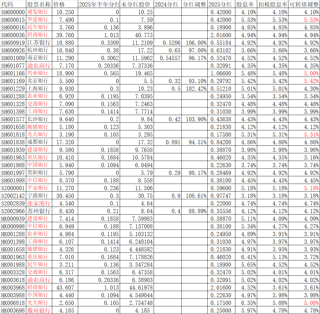 由于一些行还没有给年报,不知道2025年年底总分红多少,对于我纳入研究的银行股还没有年报的,采用三季报或者快报每股利润增长幅度,代替2025年分红增长幅度,进而推算出2025年分红额。