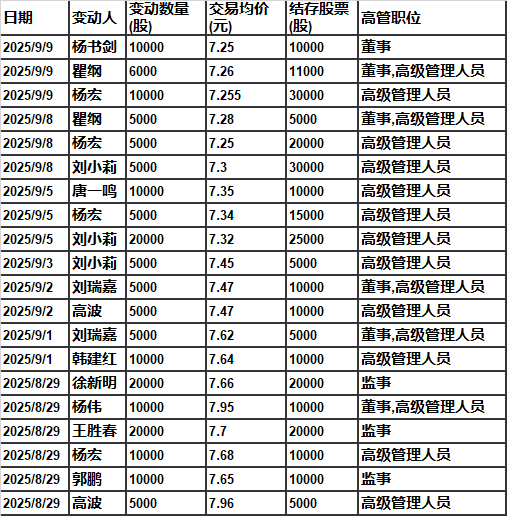 2025年8月29日开始,华夏银行高管开始自有资金增持公司股份,一直持续到9月9日,价格从7.25-7.96。其中真正的高级管理员增持约190万,其他各级网点骨干员工增持3000万左右,合计3190万元。以下是高级管理人员增持情况: