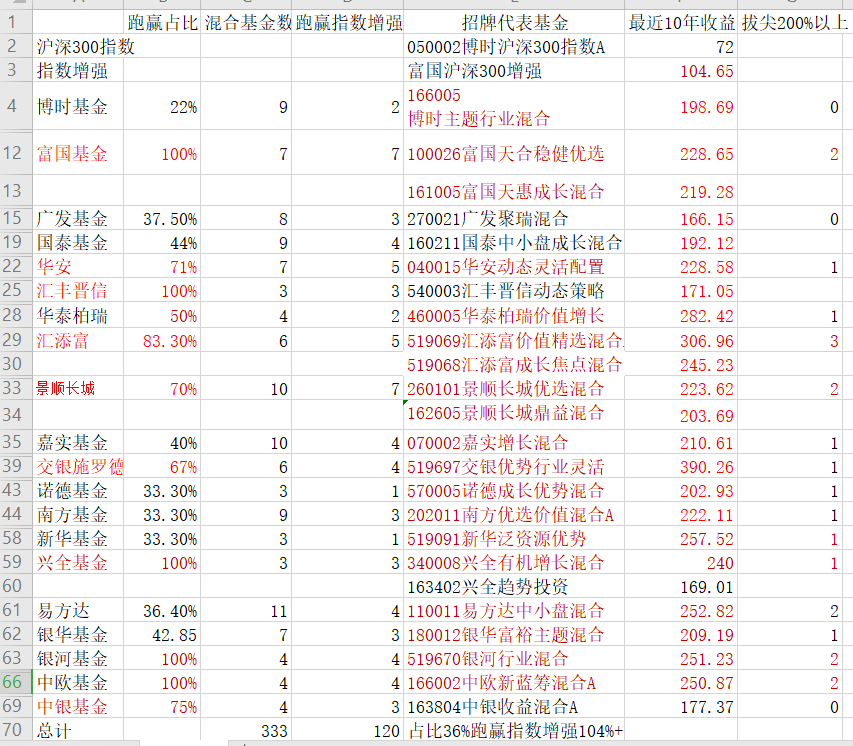 收益大幅度跑赢指数 ,10年累计200%以上的基金公司,富国,景顺长城,银河,中欧各有2只,汇添富有3只占了本公司基金数的一半。