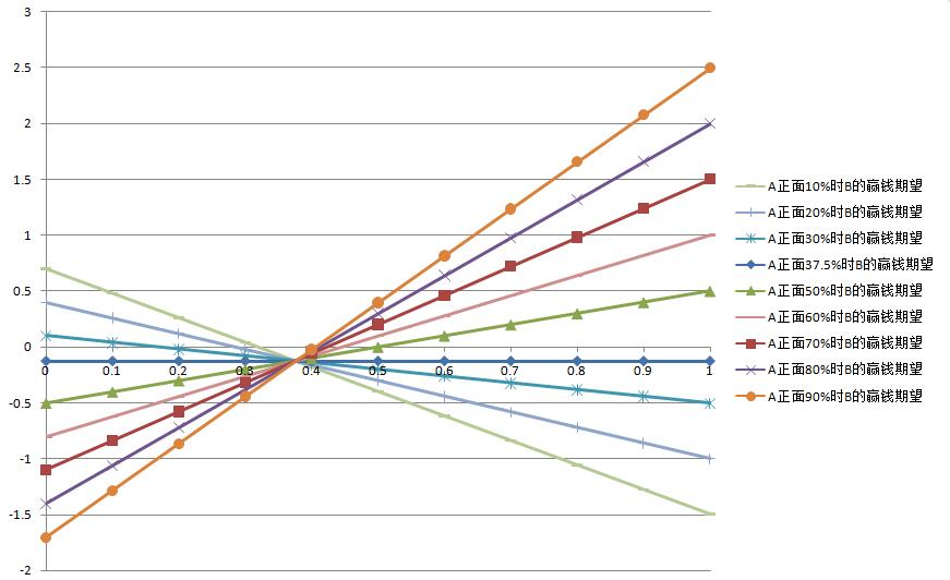 若两人都出正面,B赢3块,若两人都出反面,B赢1块。